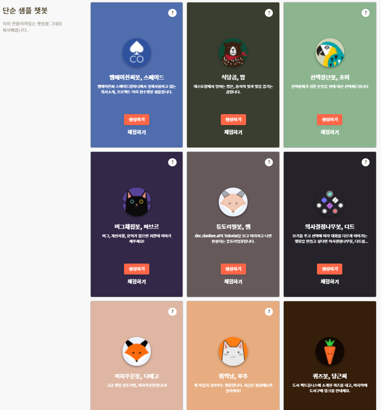 이외에도 다양한 컨셉의 챗봇이 있습니다. 템플릿은 챗봇의 다양한 컨셉을 담았기 때문에 템플릿을 참고하여 응용된 버전으로 업그레이드하는 데 많은 도움이 됩니다.