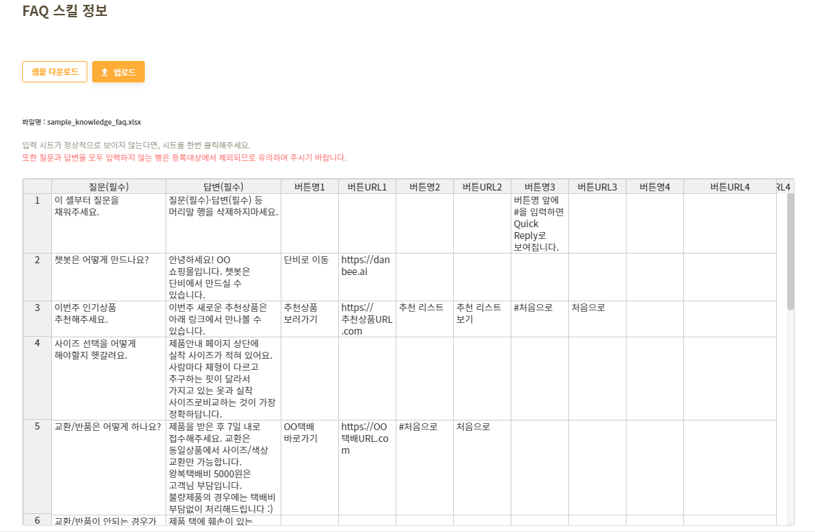 FAQ 스킬 정보에서는 엑셀 시트를 활용해서 질문과 답변을 통해 원활한 소통이 될 수 있도록 설정할 수 있습니다.