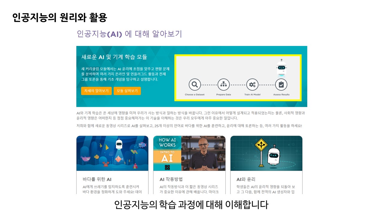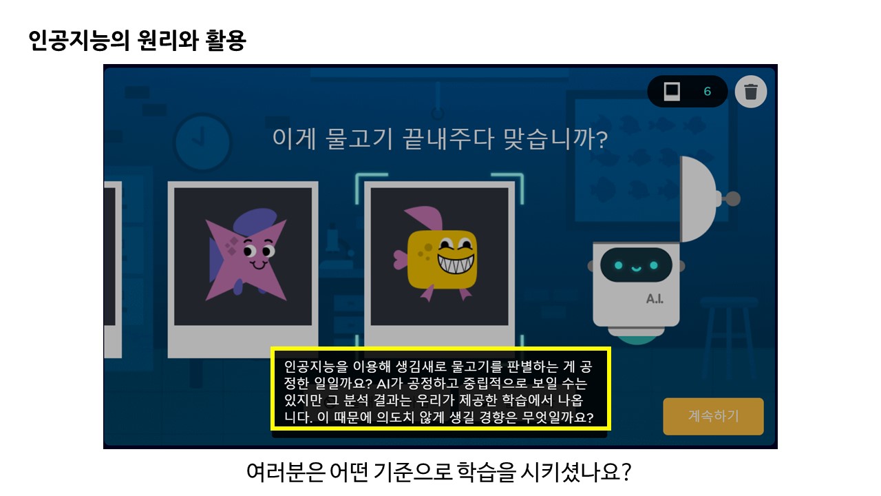 그 중에서도 인공지능 탐구를 통해 머신러닝, 학습에 대한 기본적인 원리뿐 아니라 인공지능 학습 시 주의해야 할 윤리적인 문제 이슈에 대해서도 체험할 수 있습니다.