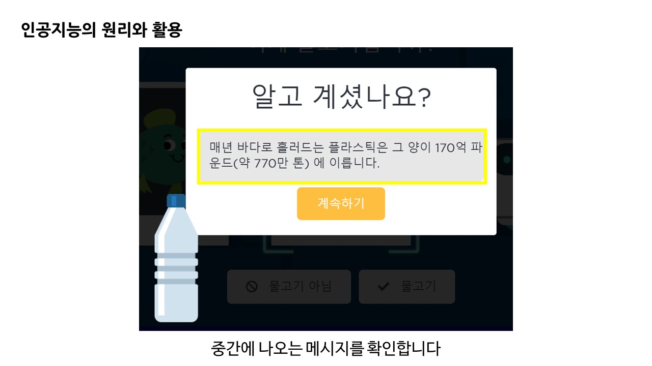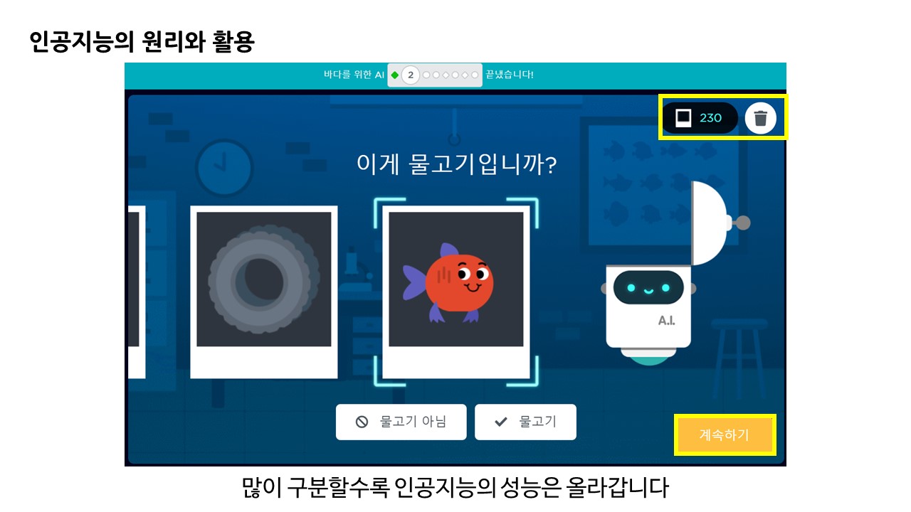 중간중간 물고기가 아닌 것을 구분할 때 바닷속 쓰레기에 대한 정보를 전달합니다.