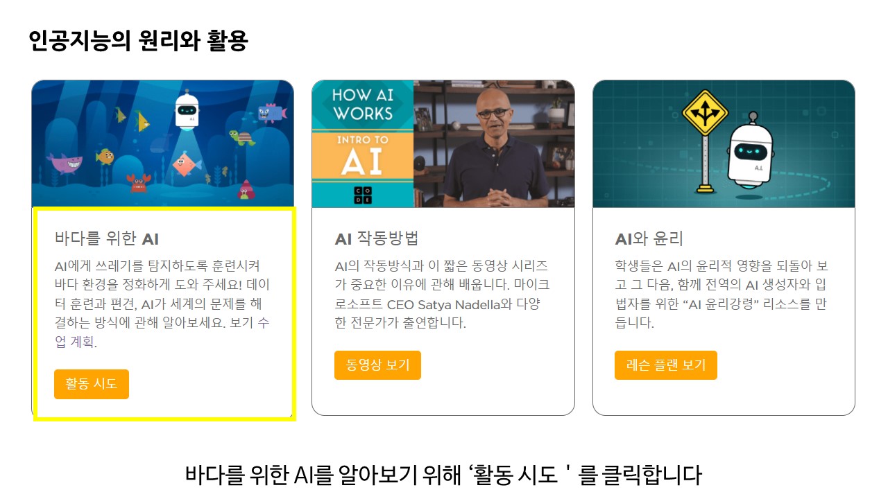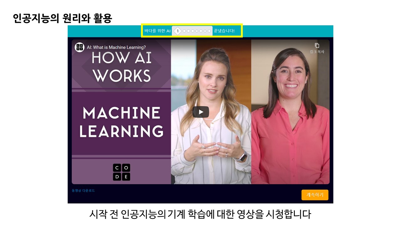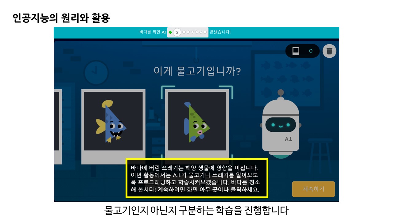 기본 배경은 바닷속 쓰레기를 인공지능을 활용하여 분류하고 처리하는 문제에 대해 체험합니다.
