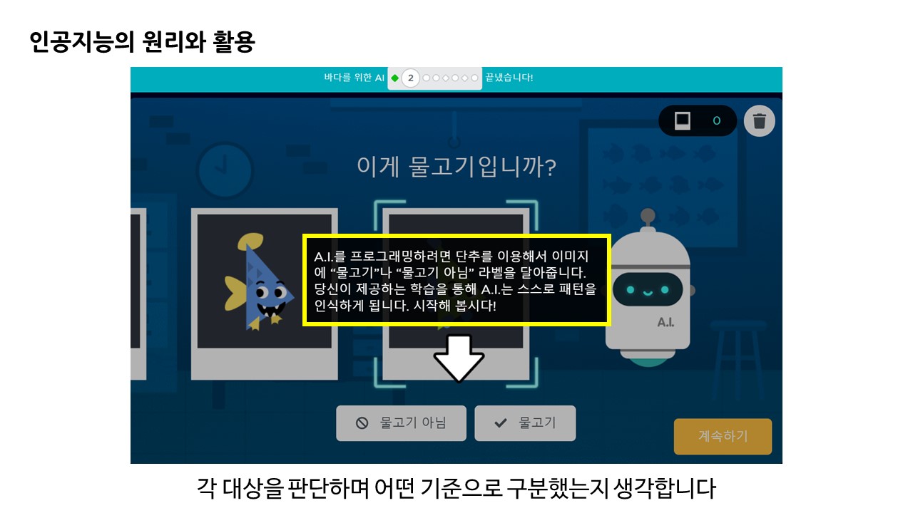 이 때 물고기와 물고기 아님이라는 기준을 설정함으로써 어떠한 기준으로 대상을 선정할 것인지 스스로 판단할 수 있도록 합니다.