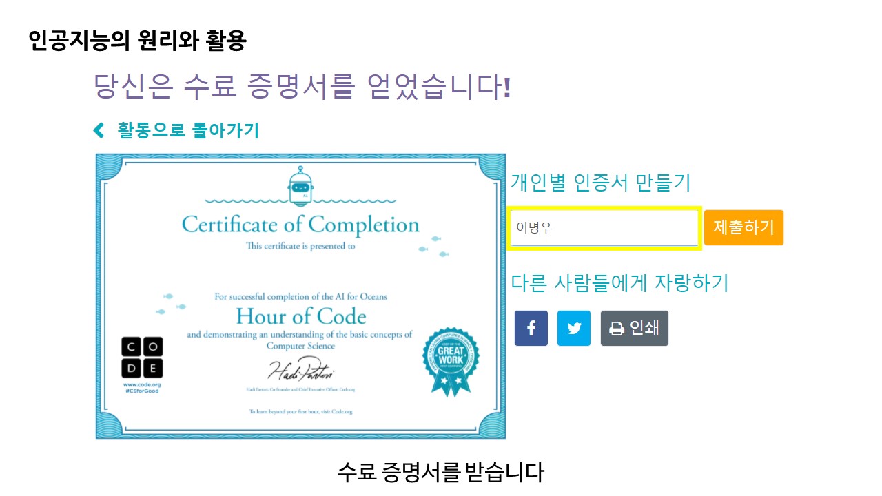 마지막으로 모든 과정을 마치면 수료 증명서를 제공합니다.