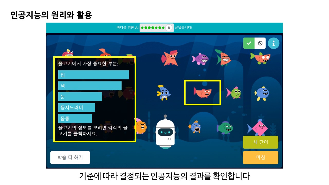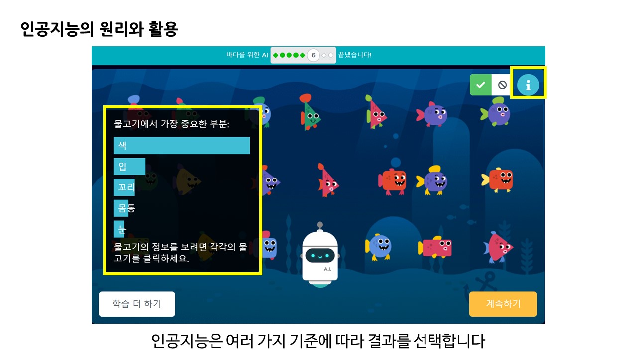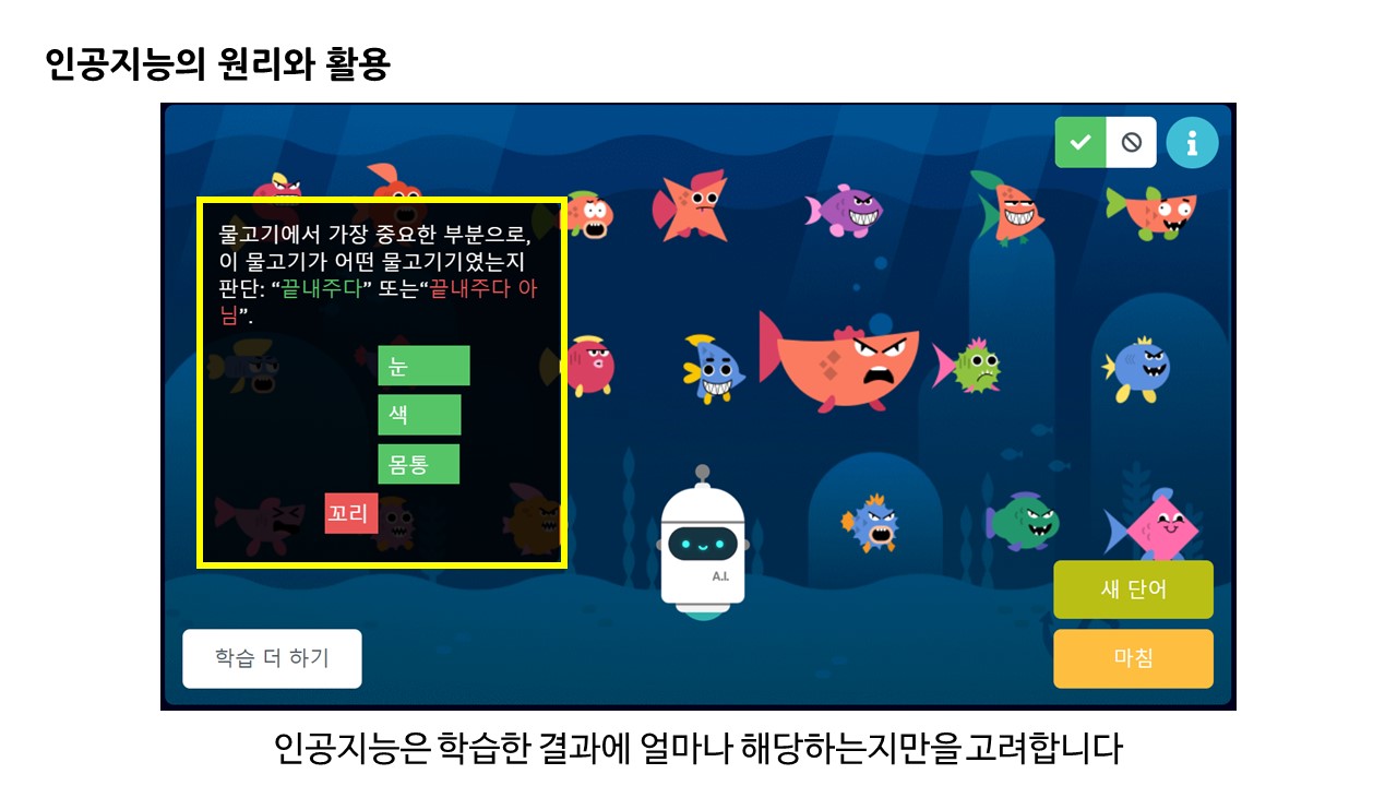 인공지능의 기초 분류 학습 원리에 대해 이해해 볼 수 있는 게임 형태의 학습 과정이었습니다.