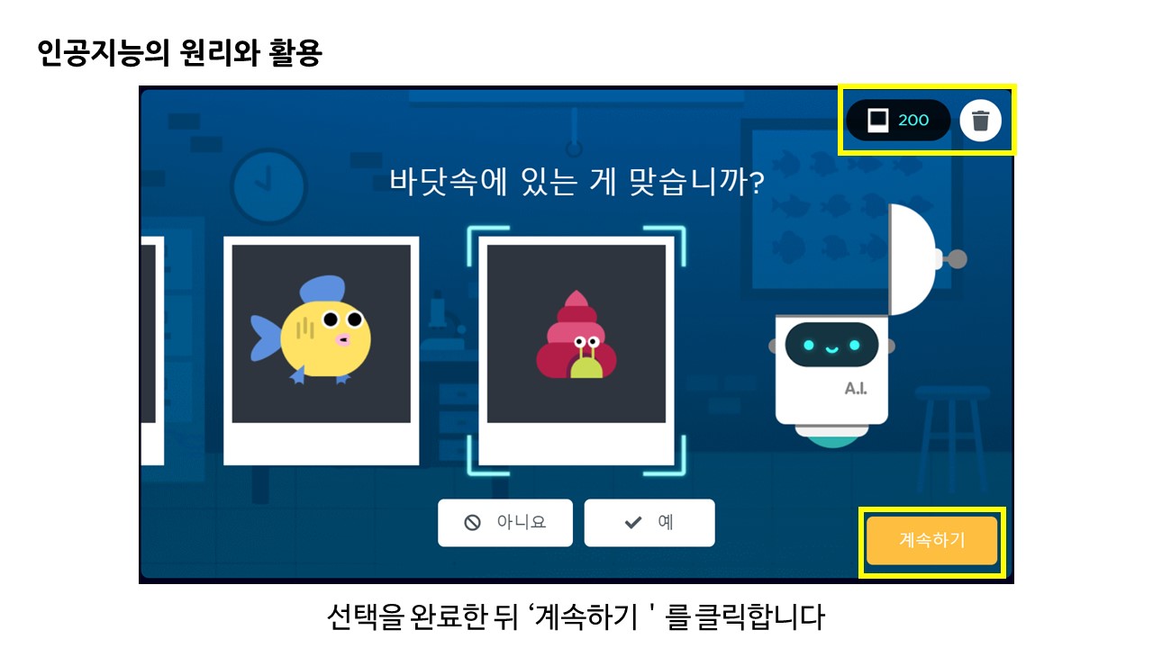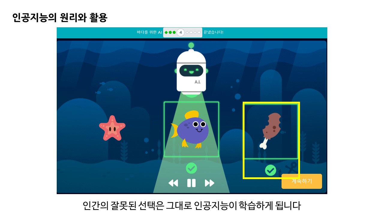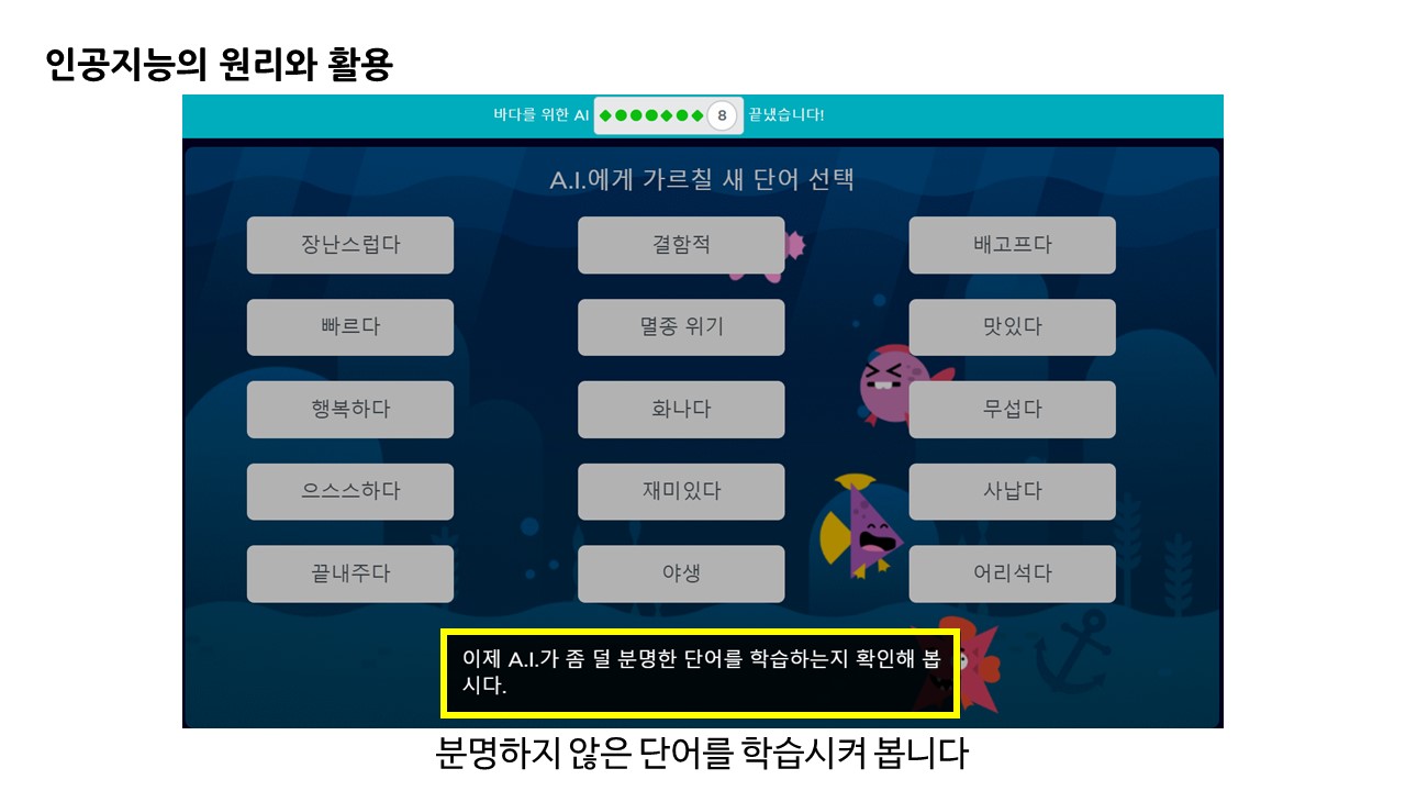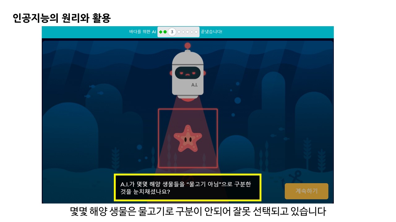 인공지능의 기초 분류 학습 원리에 대해 이해해 볼 수 있는 게임 형태의 학습 과정이었습니다.