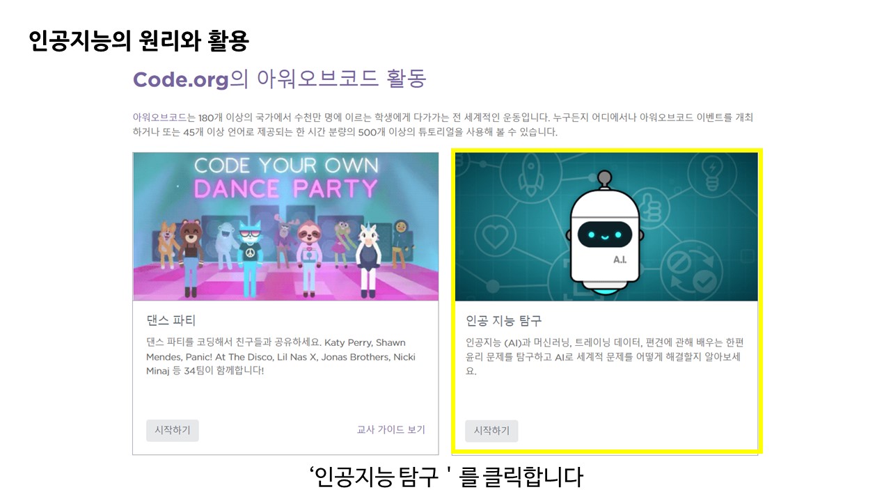 그 중 'Hour of Code'를 통해 여러 체험을 진행할 수 있습니다.