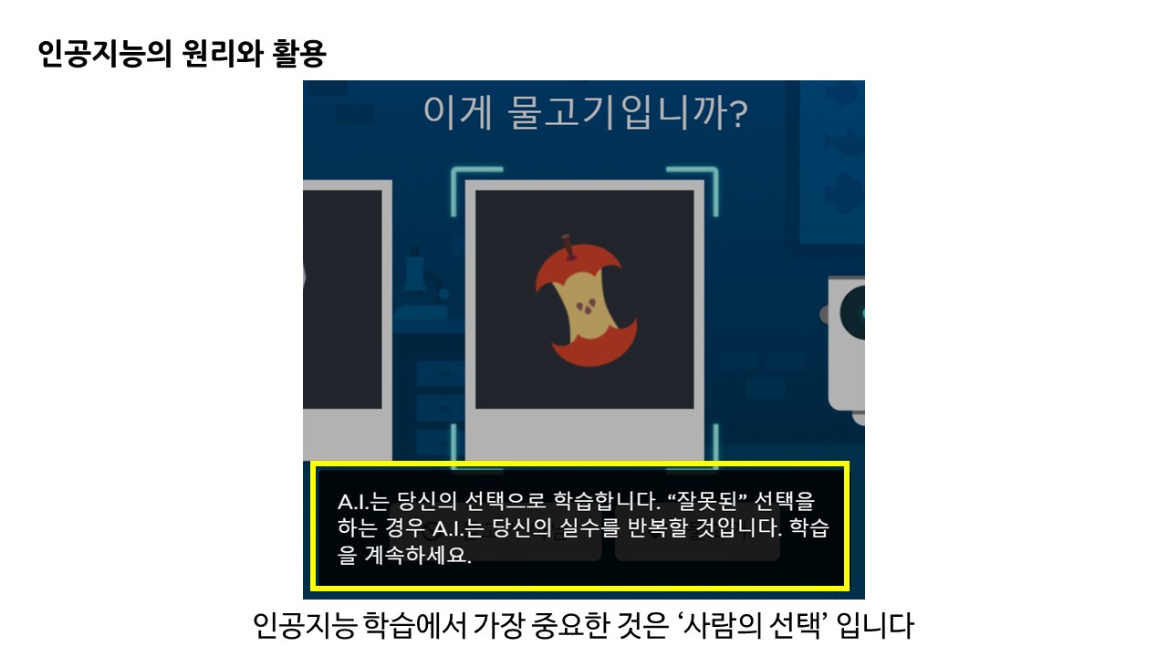 또한 인공지능이란 사람이 선택한 결과를 학습하기 때문에 사람의 판단이 무엇보다 중요하다는 것도 강조합니다.