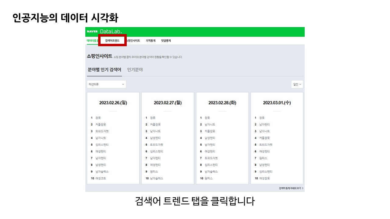 쉽게 데이터 시각화에 대한 의미와 활용성을 파악할 수 있는 도구로 네이버의 데이터랩을 활용할 수 있습니다.