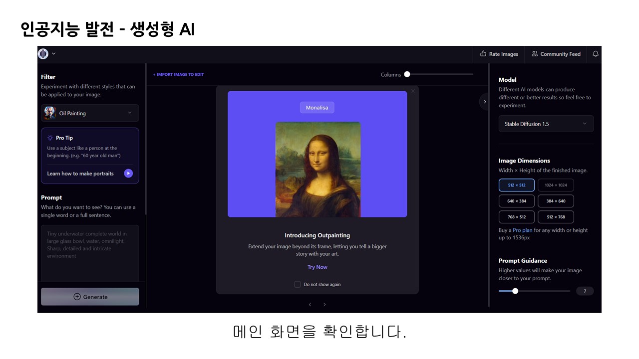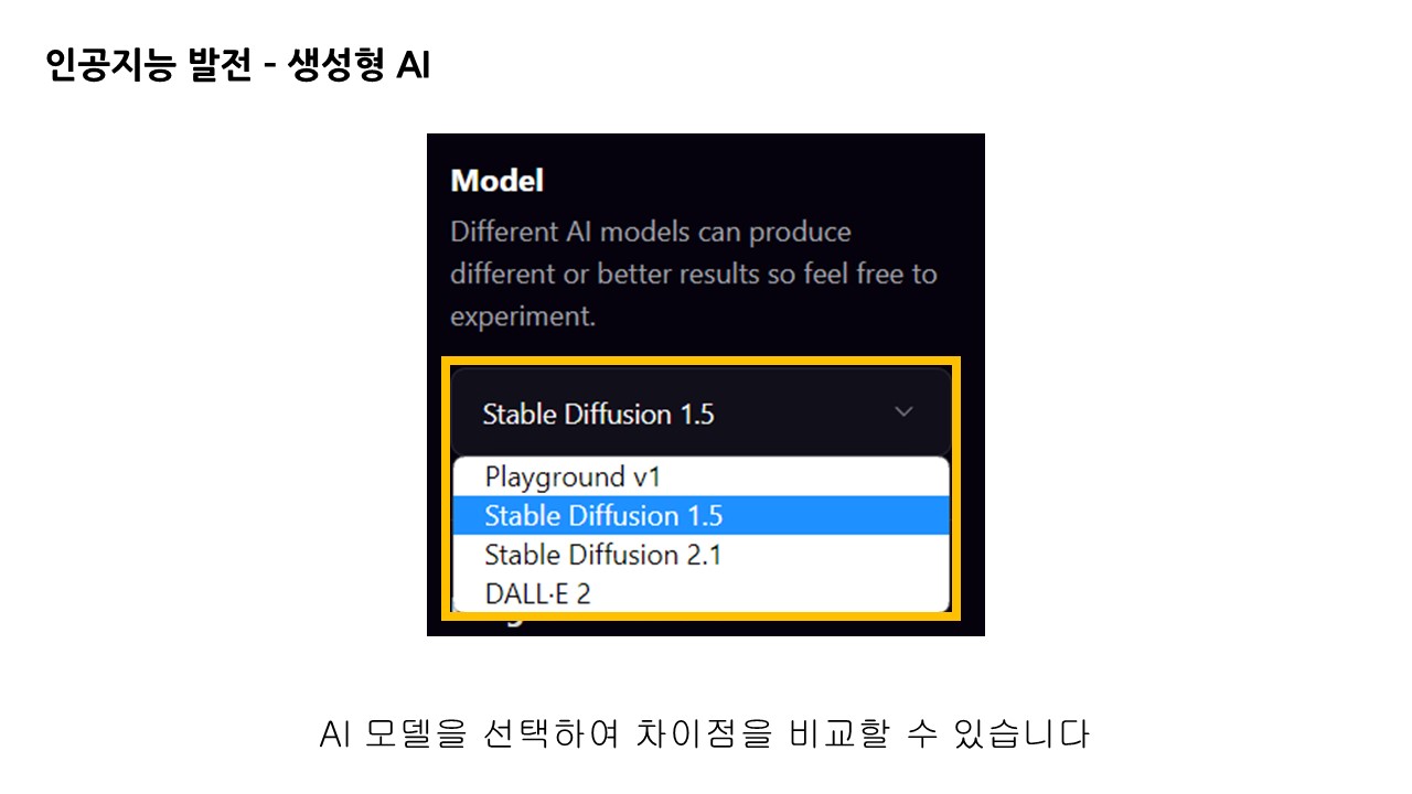 우측면에서는 인공지능 이미지 생성 모델을 선택할 수 있습니다.