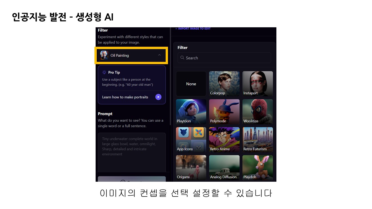 좌측면에는 먼저 필터 탭이 있습니다. 이미지를 생성할 때 어떤 컨셉으로 생성할 지 결정합니다.