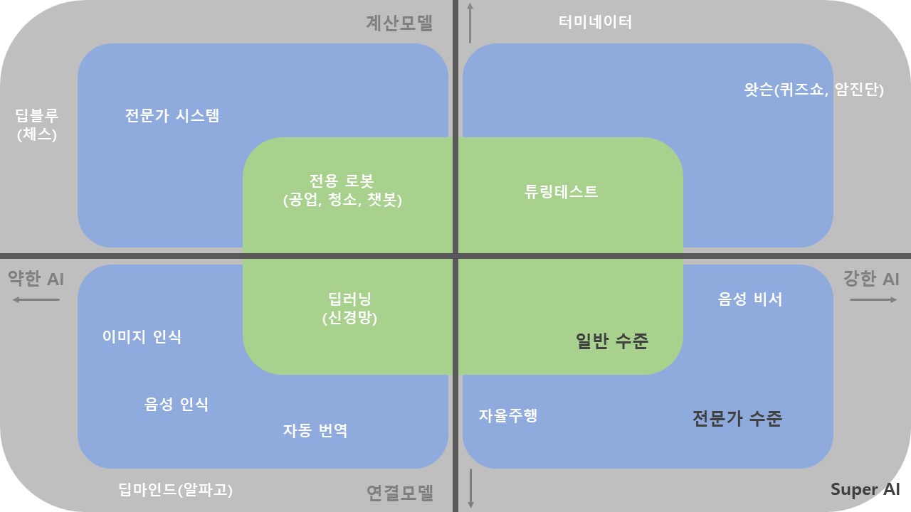 목적에 따른 분류로 '약한 인공지능','강한 인공지능','Super 인공지능'을 가로축으로 구분하고, 방법론에 따른 분류로 '계산모델'과 '연결모델'로 세로축을 구분하였습니다. 튜링테스트는 인간의 사고나 행동을 모사할 수 있는지를 테스트하는 것으로 계산모델에 가까운 내용이며, 이것은 IBM의 왓슨의 형태로 발전하여 퀴즈쇼에서 인간과 대결을 하거나 향후 암진단을 자체적으로 할 수 있는 Super 인공지능으로 발전할 가능성이 있습니다. 딥블루 같은 경우 체스라는 특정 알고리즘을 학습하는 방향으로 발전된 약한 인공지능이며, 현재 활발히 연구되고 실생활에도 적용되고 있는 이미지 인식, 음성 인식, 자동 번역과 같은 내용도 연결 모델에 근거한 약한 인공지능으로 볼 수 있습니다.