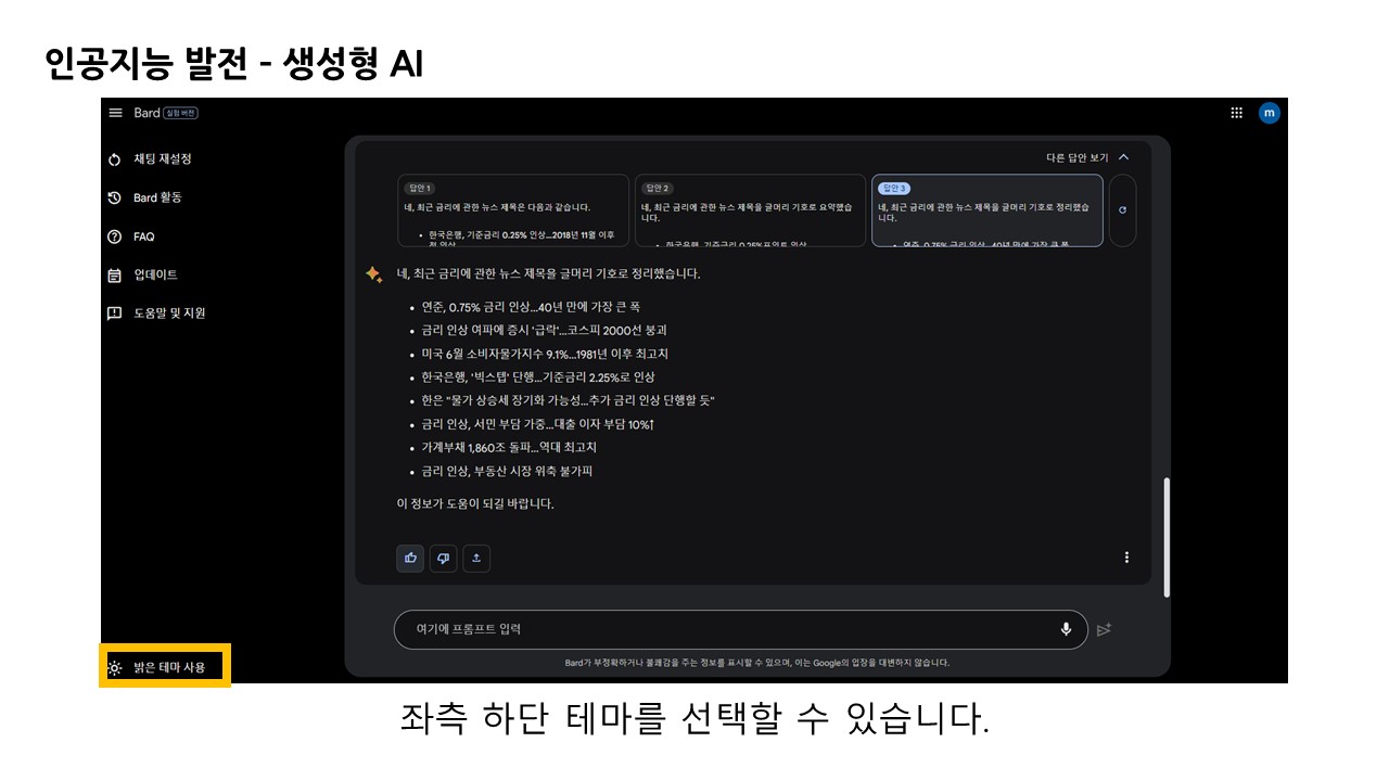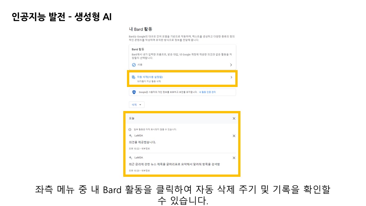 메뉴 중 내 Bard 활동 내용을 보면 자동 삭제 주기를 설정하거나 질문 및 답변 내용을 확인 할 수 있습니다.