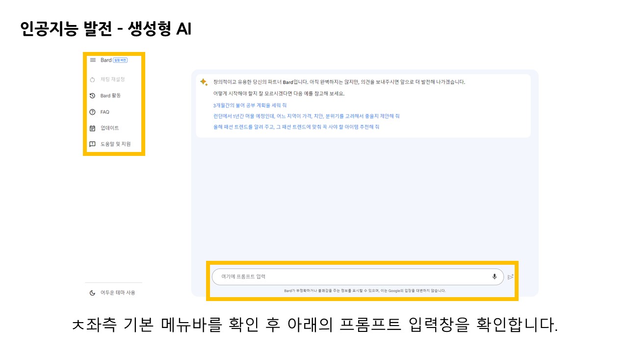 좌측 메뉴가 있고 아래에 프롬프트 입력창에 내용을 입력합니다.