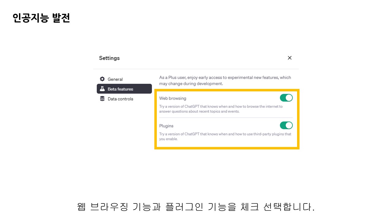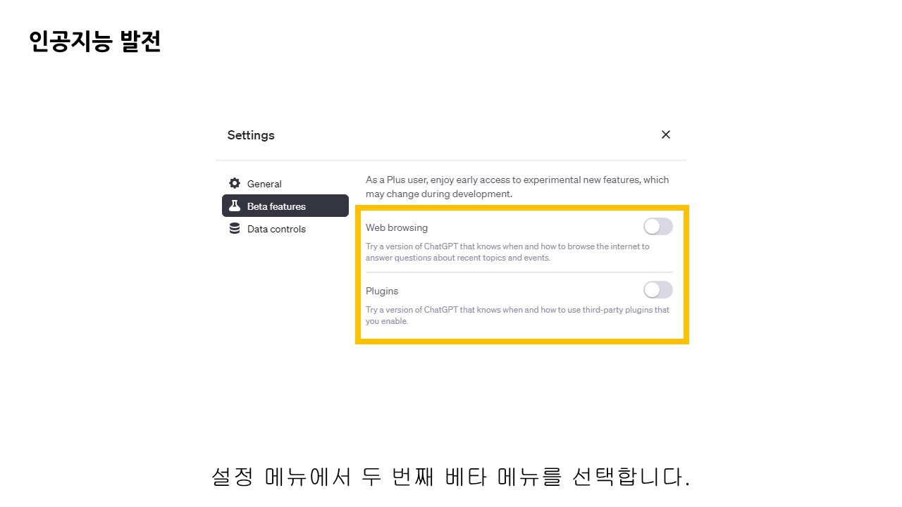 베타 버전에 대한 기능들을 설정할 수 있는데, 웹 브라우징 기능과 플러그인을 토글로 설정할 수 있습니다.