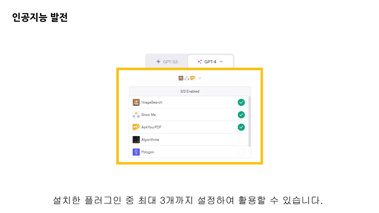 이렇게 여러 개의 플러그인을 설치하더라도 실제 챗GPT와의 대화에 적용할 수 있는 플러그인의 개수는 3개로 한정되어 있습니다. 정해진 개수를 잘 활용하여 필요한 결과물을 얻는 것이 중요합니다.