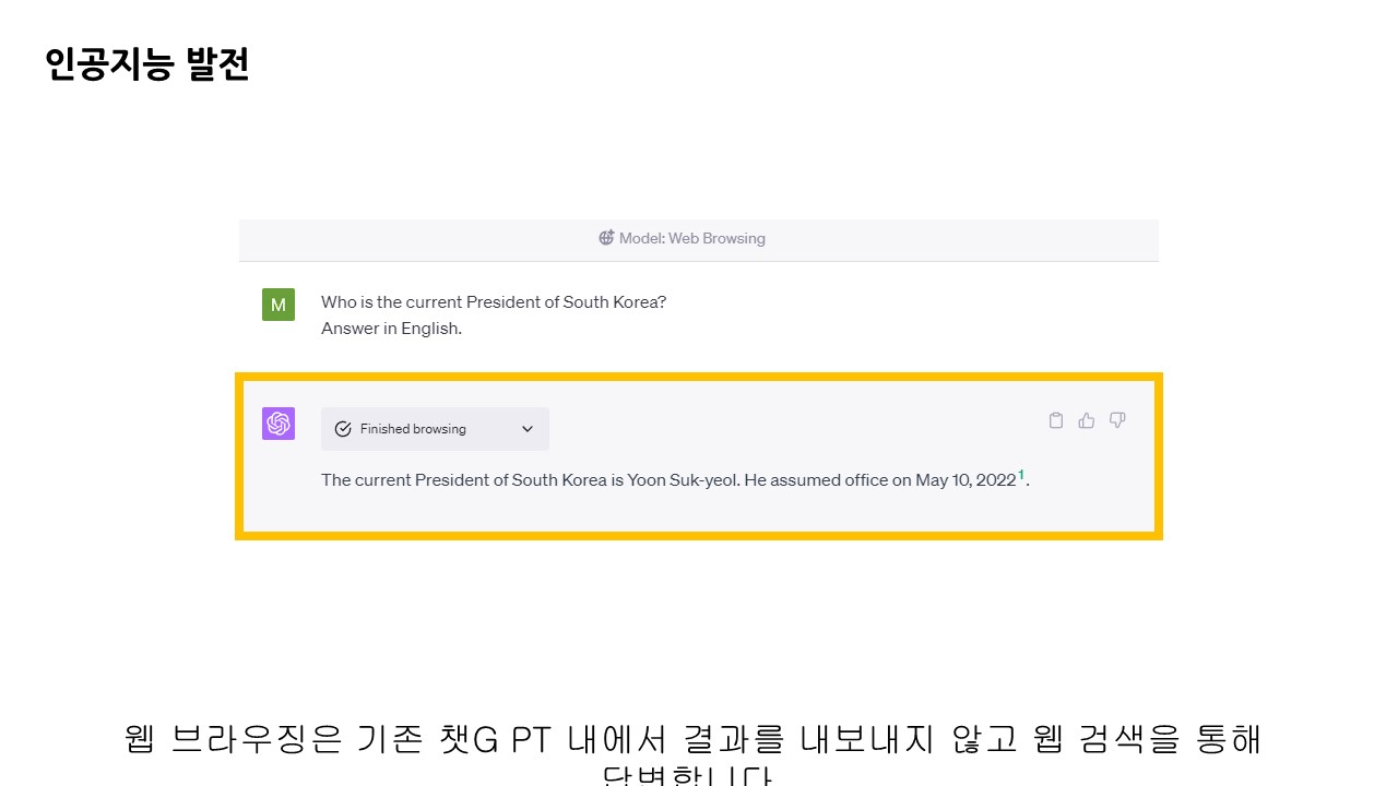 이전에 챗GPT에게 같은 질문을 했을 때 2021년 이후 데이터 학습이 되지 않았기 때문에 잘못된 답변을 내놓았던 것과 비교해서 정확한 결과를 알려줍니다. 이렇게 되면 마이크로소프트의 빙 챗과의 차이점은 크게 상쇄되는 듯 보입니다.