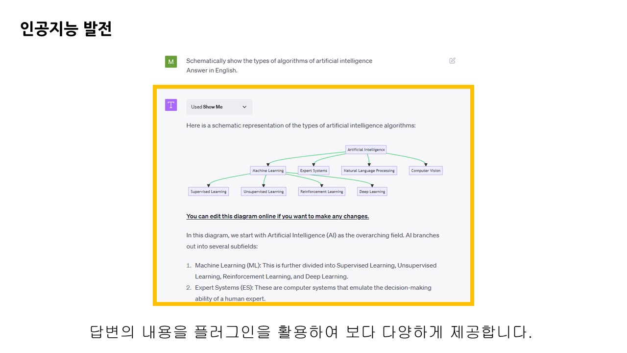 기존 질문에는 텍스트 내용으로만 알려주었다면 'Show Me'라는 플러그인 프로그램을 사용하여 적절한 다이어그램을 섞어 효과적으로 설명해줍니다.