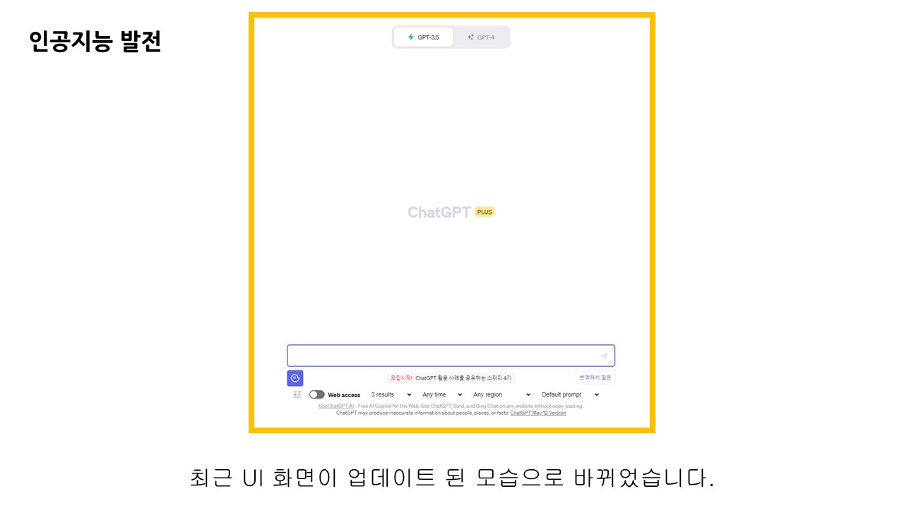 먼저 챗GPT 메인 화면으로 이동하면 플러그인 업데이트와 함께 UI화면도 변화한 것을 볼 수 있습니다. 위 쪽에 GPT3.5와 GPT4 중 선택할 수 있게 되어 있습니다. 위 그림은 챗GPT PLUS 계정으로 업그레이드 해야 확인할 수 있습니다. 확실히 과금 여부에 따라 사용성을 제한한 듯 합니다.