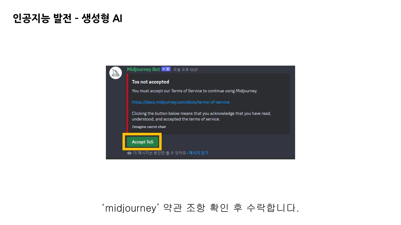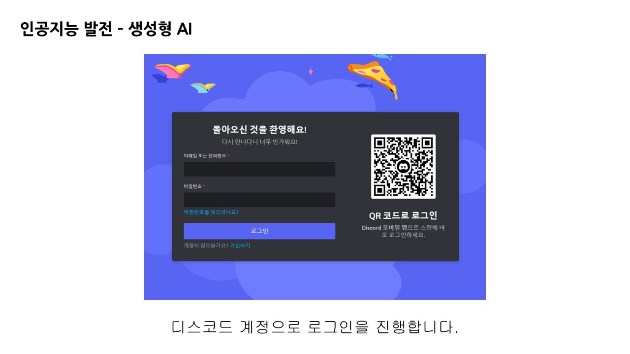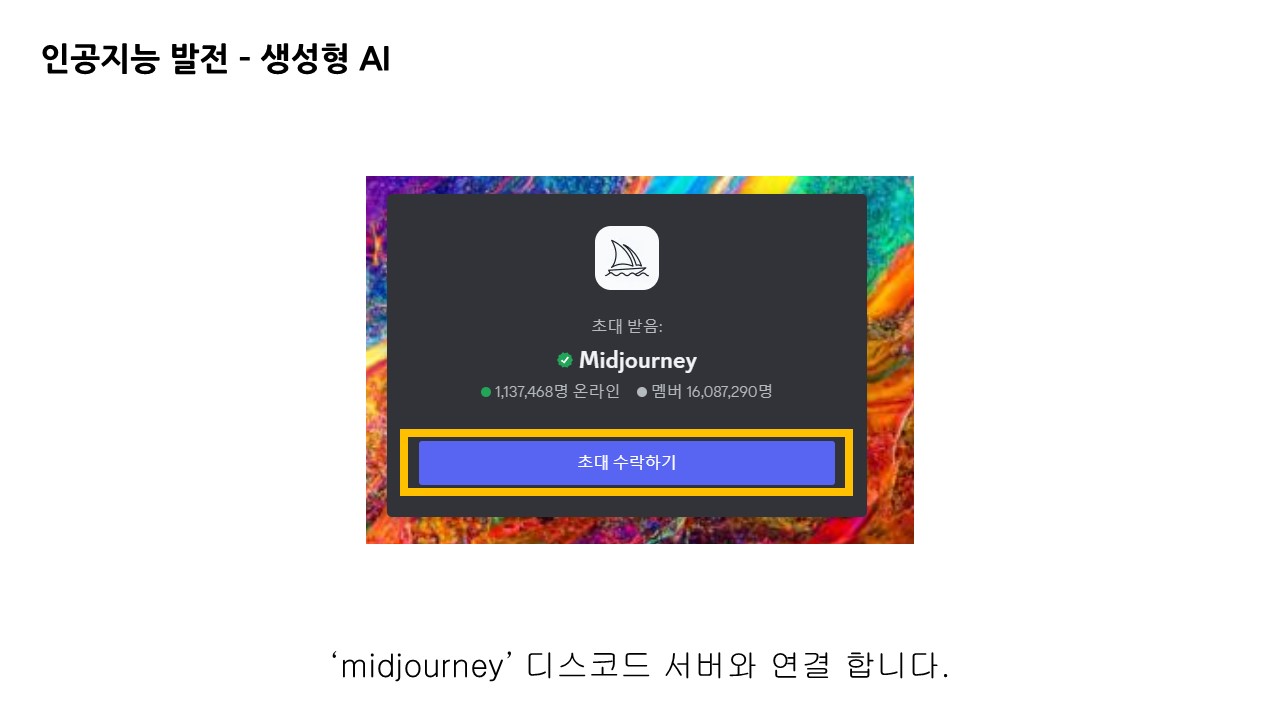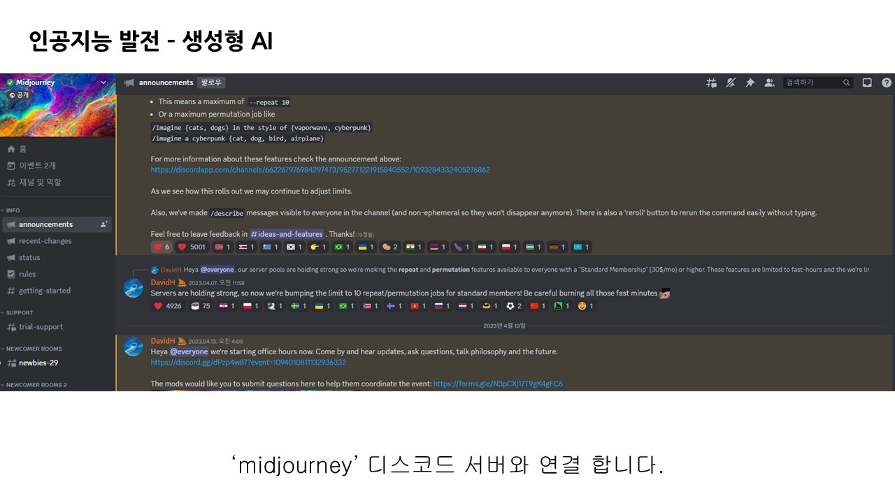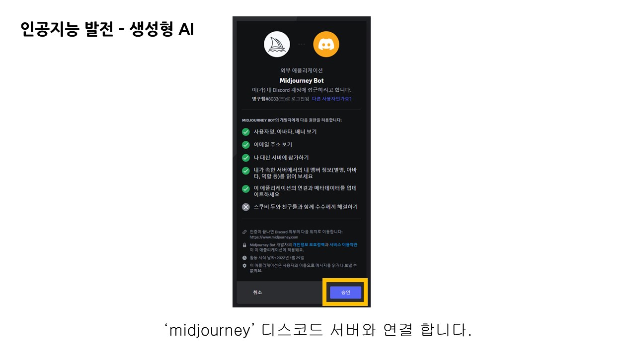 미드저니의 경우 디스코드 서버로 연결하여 사용자와 상호작용하며, 디스코드 계정을 활용합니다.