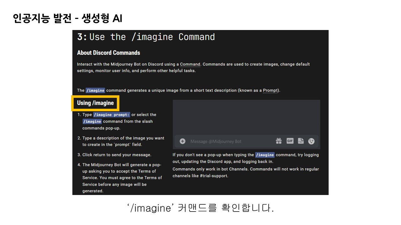 하단의 프롬프트 창에 이미지 생성 요청을 할 수 있는 프롬프트 명령어는 매뉴얼을 확인해보면 '/imagine' 입니다.