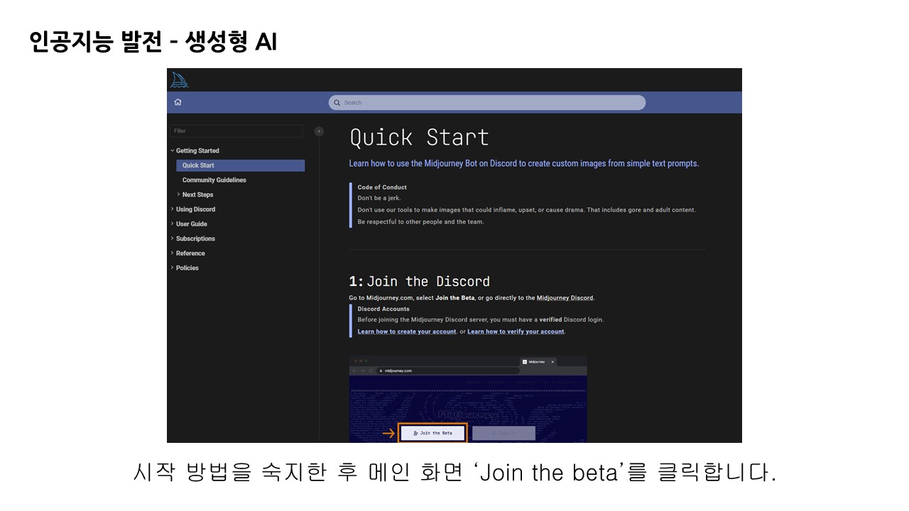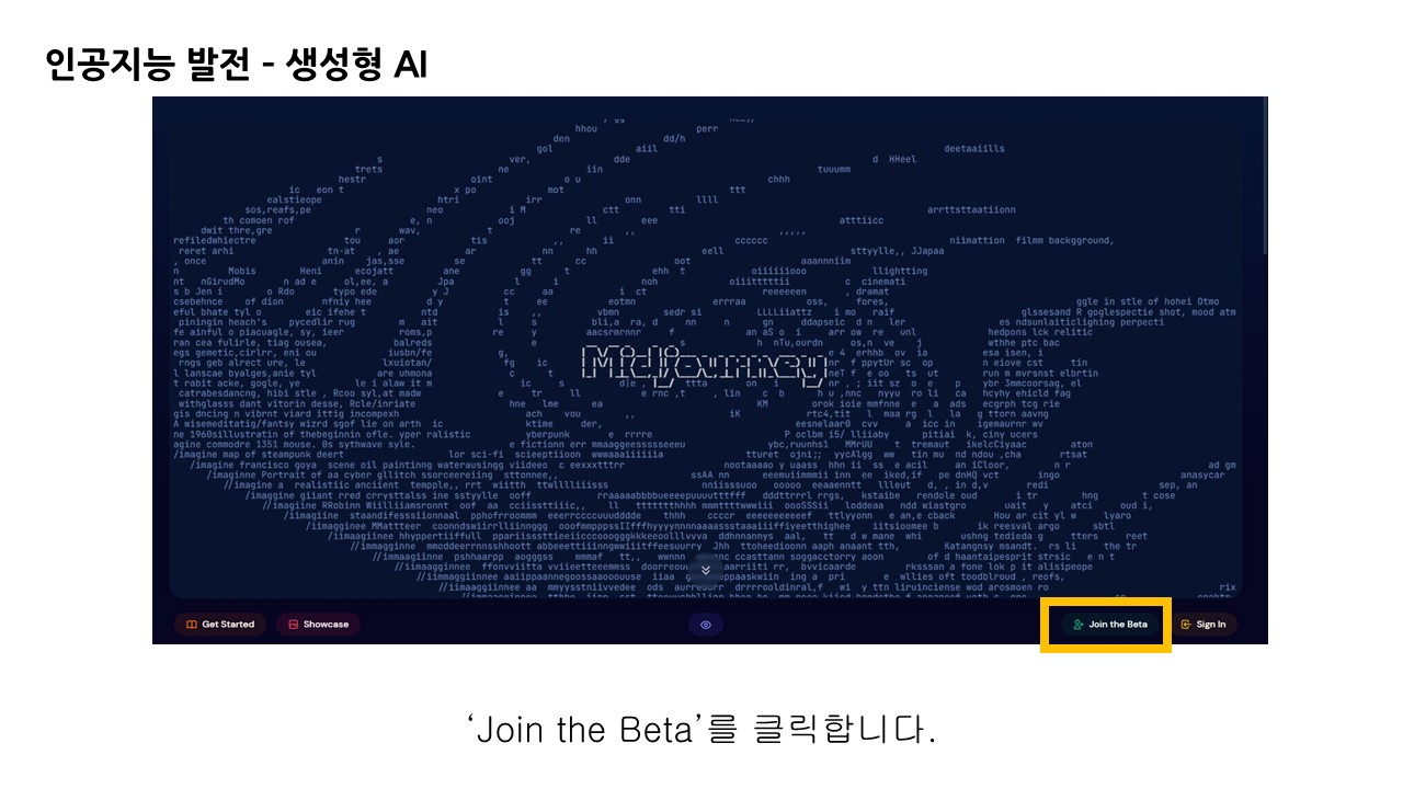 메인 화면의 우측 하단 'Join the Beta'로 접속합니다. 미드저니 또한 베타버전으로 실험적인 성격이 있습니다.