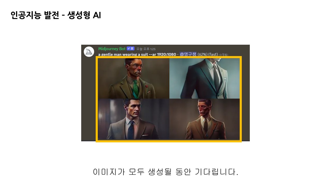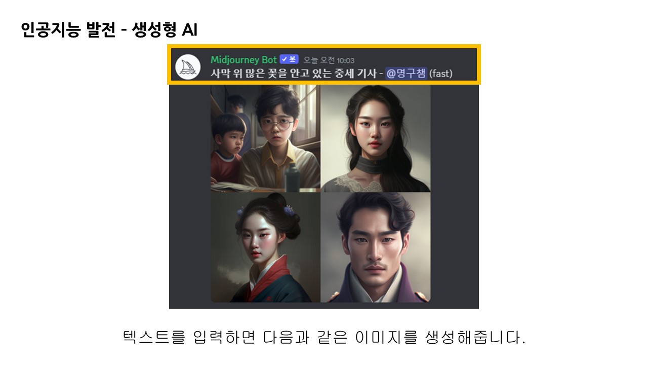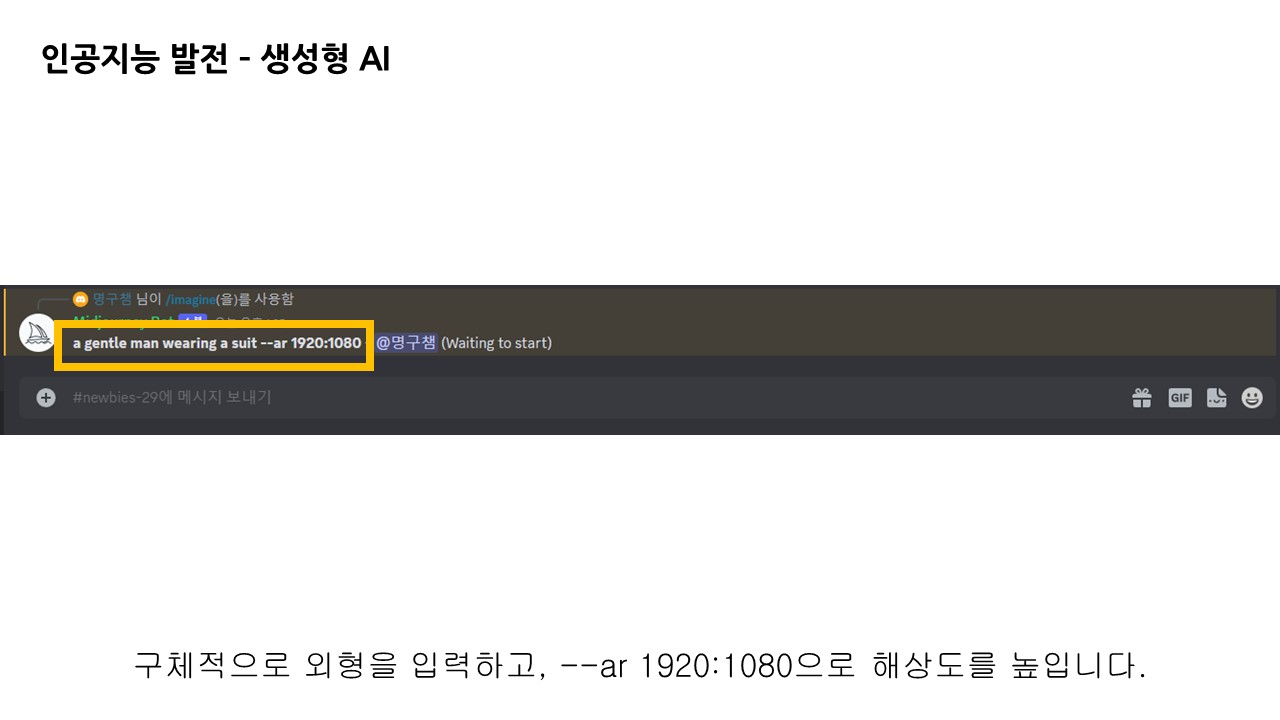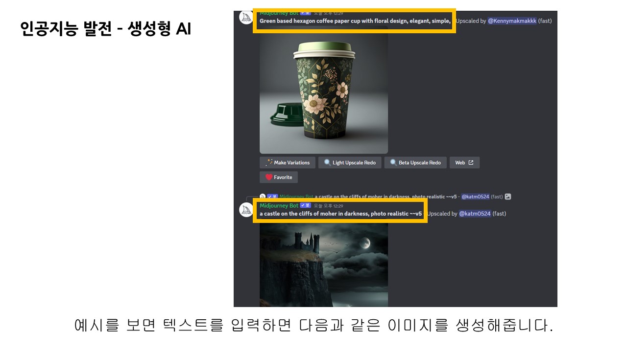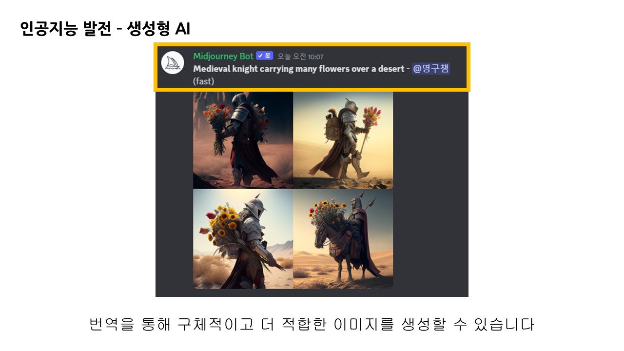 명령어 다음 프롬프트 창에 문장을 입력한 뒤 전송하면 미드저니 봇에 의해 이미지가 생성됩니다.