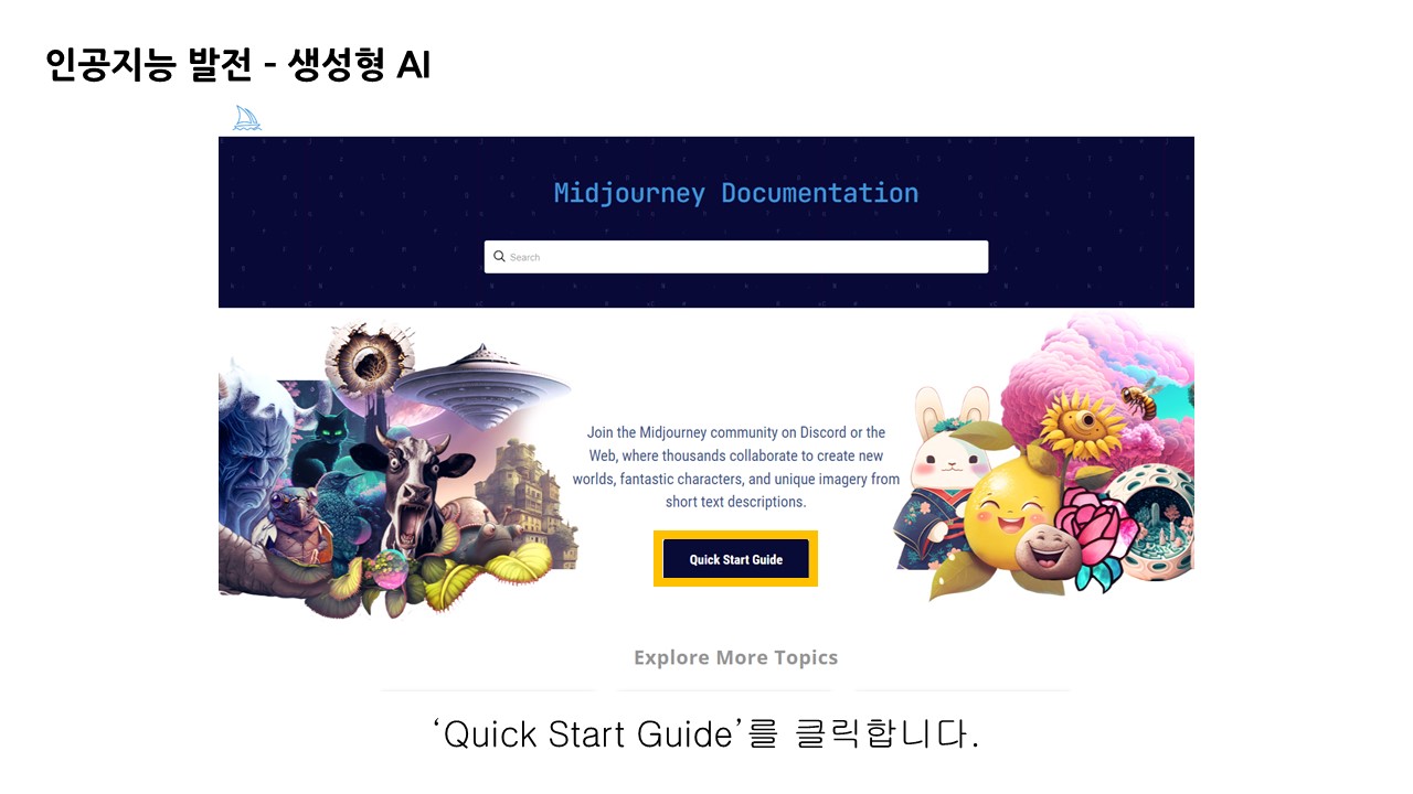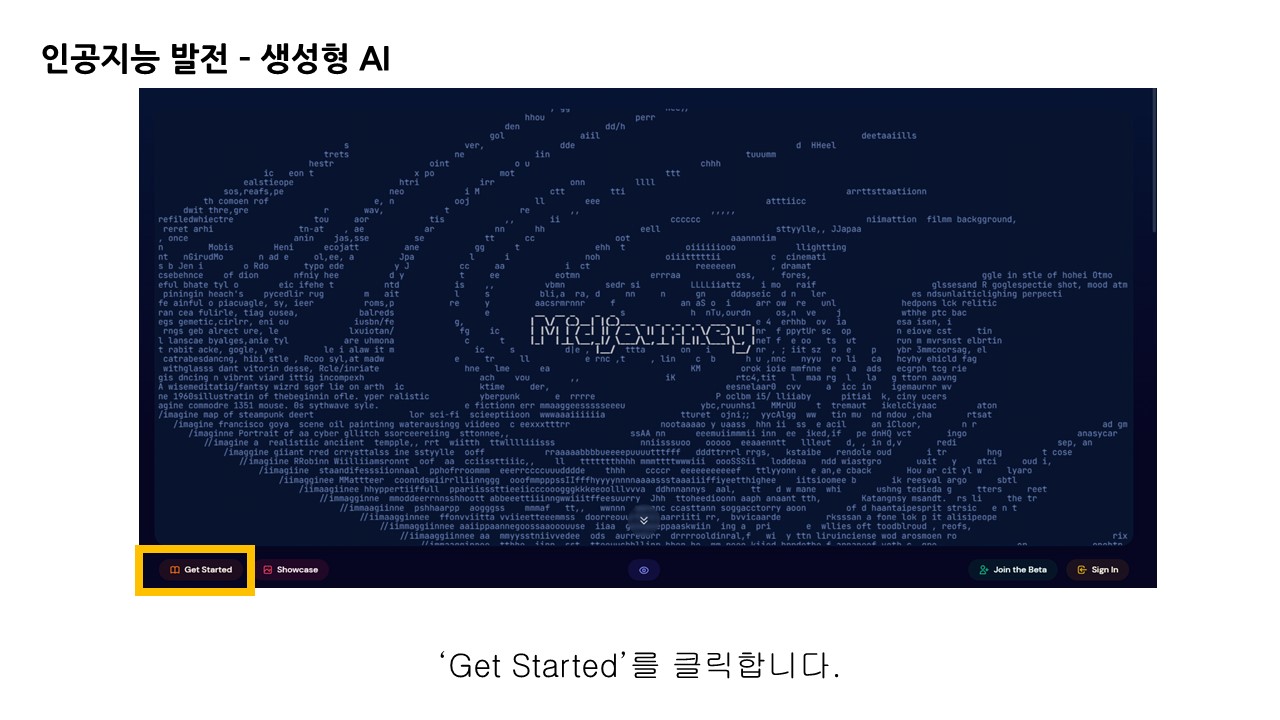 먼저 검색창에 미드저니를 검색하여 웹 사이트로 이동합니다. 다음 'Get Started'를 클릭하면 미드저니 사용 방법에 대한 튜토리얼 매뉴얼을 확인할 수 있습니다.