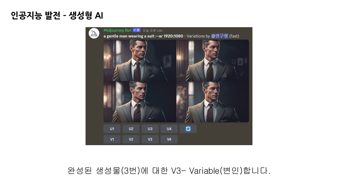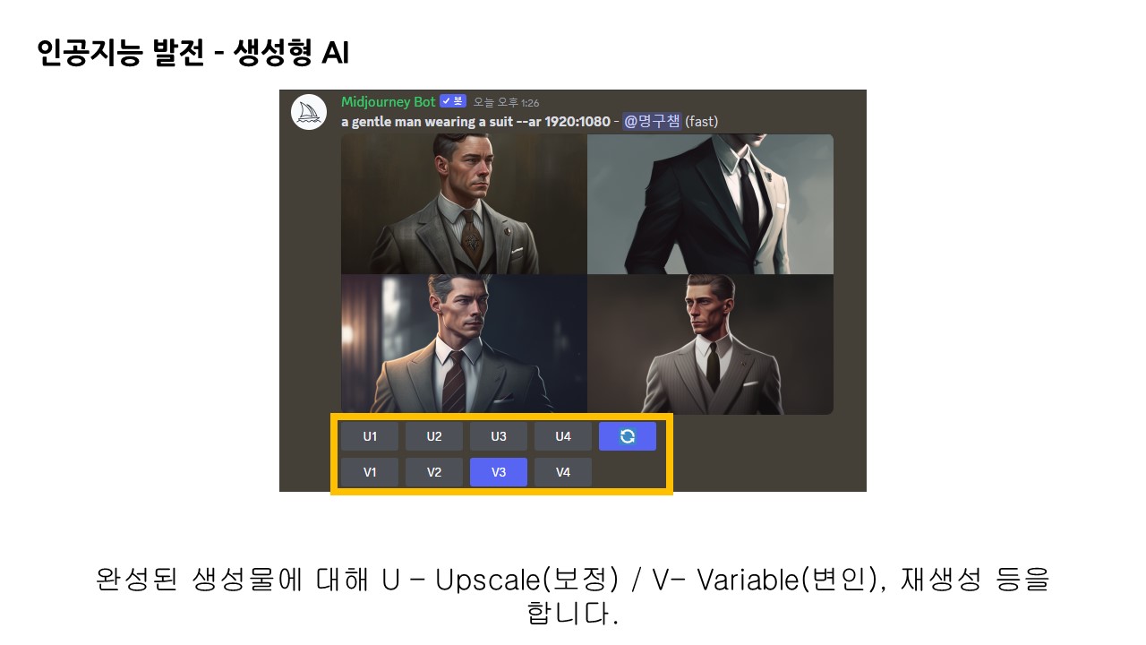 1차적으로 생성된 이미지 아래에는 U1,2,3,4와 V1,2,3,4가 있는데 U는 Upscale로 1,2,3,4번째 이미지를 보정하여 재생성해주는 기능입니다. V는 Variable 변수로, 1,2,3,4번째 이미지를 기준으로 각기 다른 형태의 이미지를 재생성합니다.