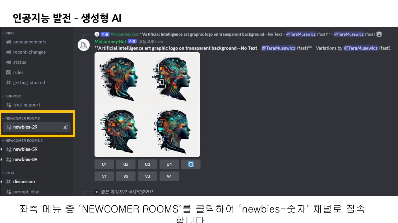미드저니에 처음 온 신입생들을 위한 newbies 채널로 이동하면 실시간으로 텍스트를 이미지로 생성하고 있는 광경을 목격할 수 있습니다.