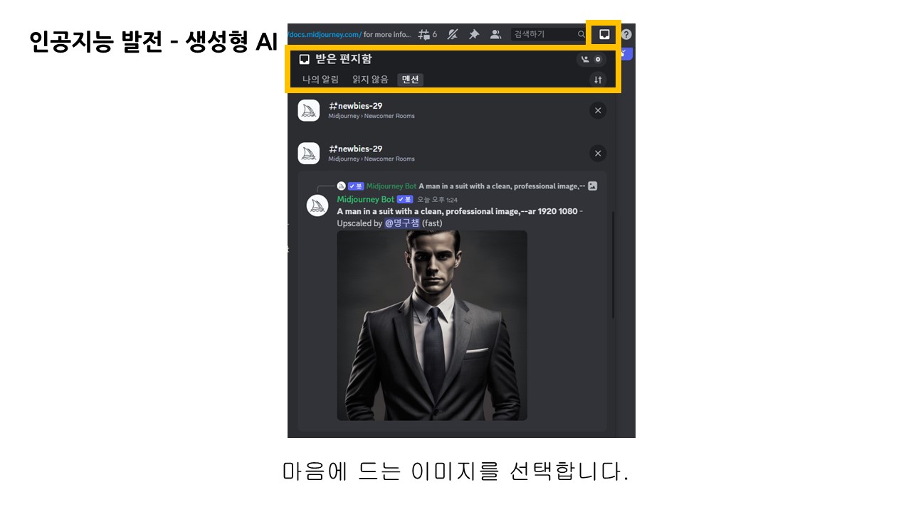 오른쪽 상단 받은 편지함 아이콘을 클릭하면 내가 입력하고 생성된 이미지의 기록 리스트를 확인할 수 있습니다. 워낙 다른 사람들이 주문하는 이미지가 빠르게 올라오기 때문에 이 받은 편지함에서 이동하는 것이 편리합니다.