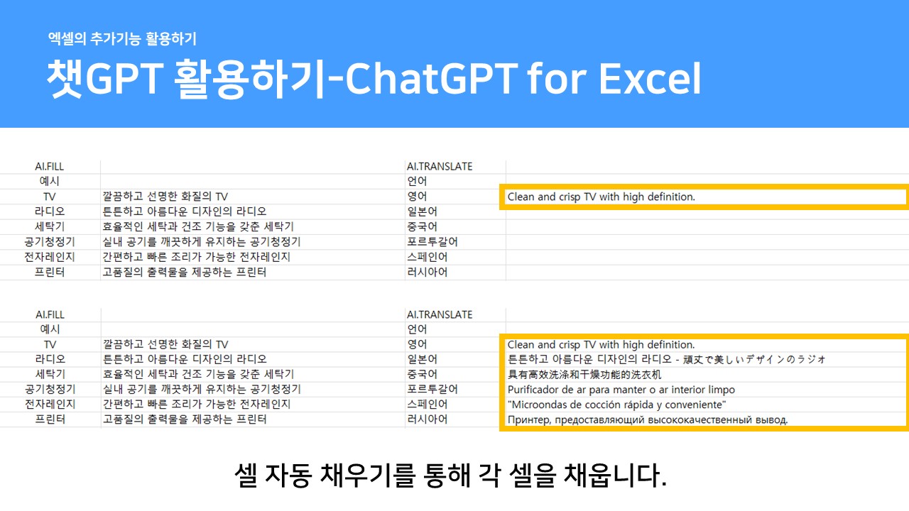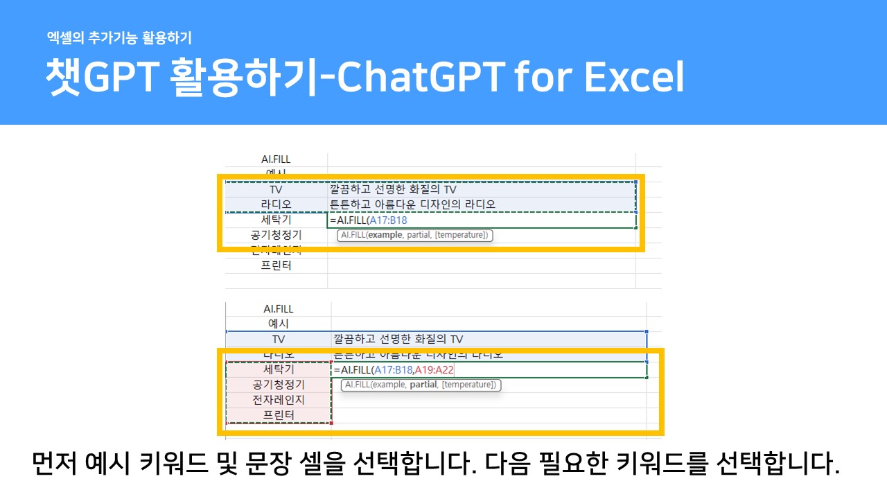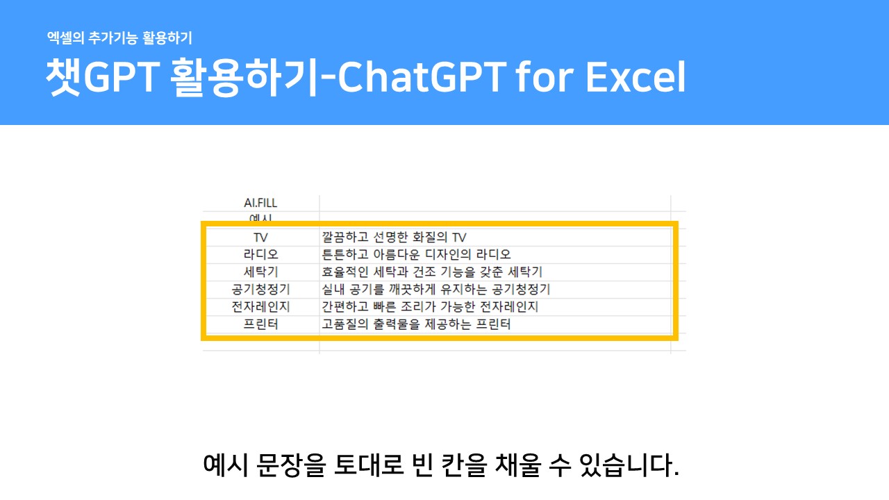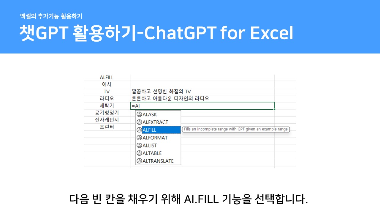 다음은 FILL 기능의 함수입니다. 엑셀 사용 시 가장 많이 사용하는 자동채우기 기능과 유사하나, 예시를 참고해서 챗GPT가 창의적인 문구를 완성하여 채운다는 점에서 기존 자동채우기와는 목적이 다르다고 볼 수 있겠습니다.