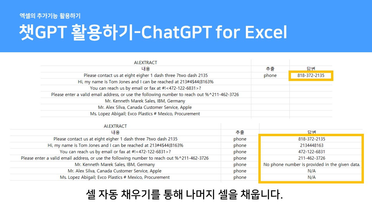 다음과 같이 추출 키워드에 맞춰 내용을 정리하여 줍니다. 단순히 텍스트를 분류하는 정도가 아닌 숫자, 언어, 특수기호까지 인식하여 가장 자연스러운 형태로 뽑아내는 것을 볼 수 있습니다. 자동 채우기로 아래 셀까지 채우면 모든 셀이 채워지게 되고, 추출 키워드에 해당하는 내용이 없을 경우는 다음과 같이 표시됩니다.