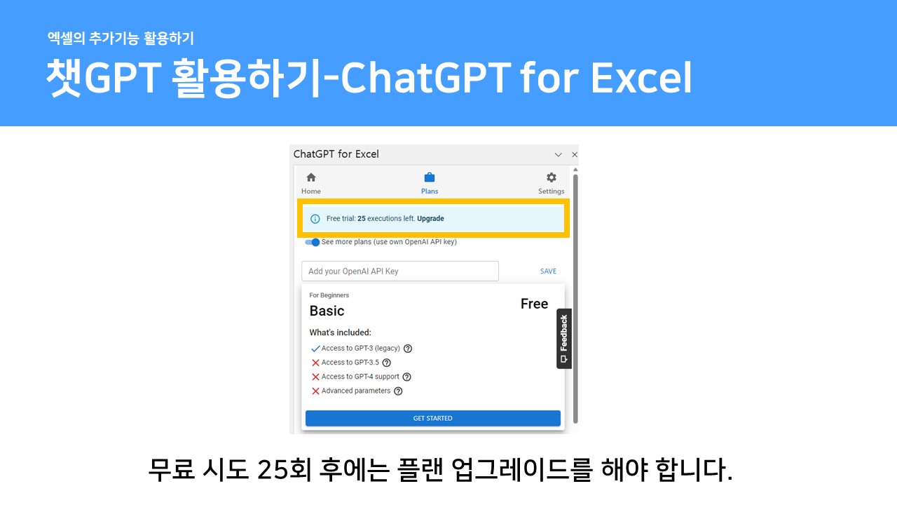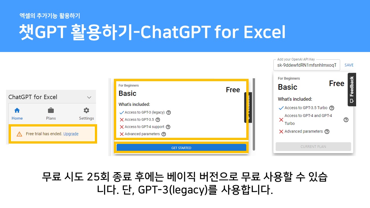 이렇게 애플리케이션을 통해 시도를 할 수 있는데 무료 시도 횟수가 25회로 한정되어 있습니다. 25회 이후에는 추가 플랜을 구독해야 하는데 무료 버전으로 BASIC을 사용할 수 있습니다. GPT3(legacy)로 되어 있는데 API Key를 연동하니 GPT-3.5 Turbo 버전을 활용할 수 있는 듯 하였습니다. 이정도면 챗GPT를 활용하는데 지장없을 것 같습니다.