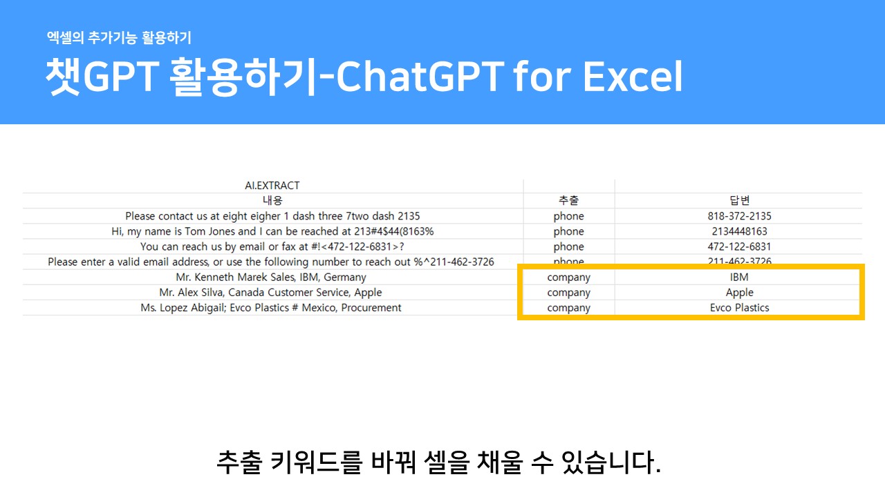 추출 키워들 바꿔 답변 셀을 채워줍니다. 추출 키워드 또한 그 내용을 포함하는 키워드를 챗GPT가 잘 인식합니다.