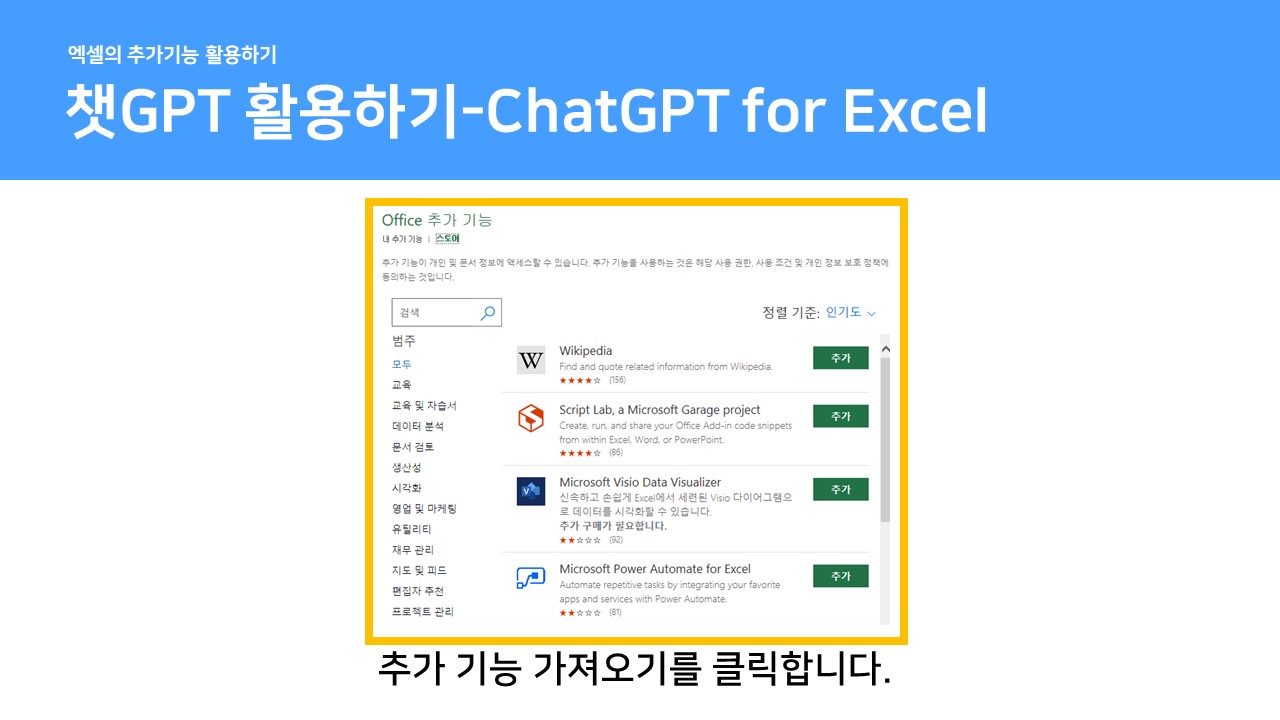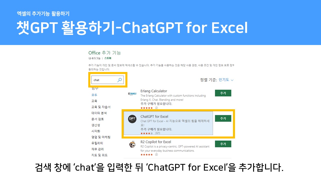 검색 창에 'chat'을 입력하면 리스트에 'ChatGPT for Excel'이라는 애플리케이션이 있습니다. 이외에도 챗GPT 또는 여러 프로그래밍 된 소스를 가져와 활용할 수 있는데, 여기에서는 이 앱을 활용해보도록 하겠습니다.