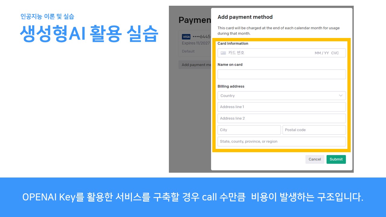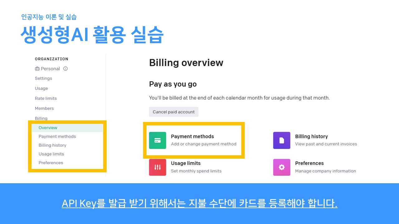 API Key를 발급받기 위해서는 먼저 결제 방식을 등록해야 합니다. 왜냐하면 프롬프트 입력에 따른 결과값을 반환받을 때마다 비용이 발생하기 때문입니다. 사용해본 경험으로는 그렇게 많이 들지 않기 때문에 많이 써도 1~3달러 정도 소요되고, GPT-4 Turbo 버전에서는 비용도 절감한다고 하니 너무 많이 나올까 걱정하지는 않으셔도 될 듯 합니다.