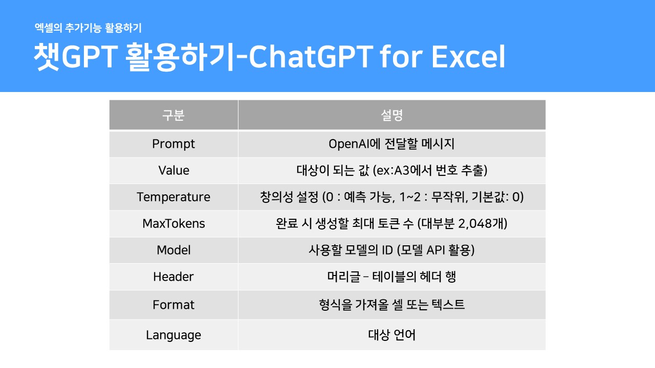 이 앱에서는 총 7가지의 함수를 활용하여 다음과 같은 내용을 챗GPT를 활용할 수 있습니다. 챗GPT를 활용하는 가장 중요한 목적은 바로 창의적인 답변과 문제 해결을 위한 과정을 학습하여 결과물을 도출해낸다는 것입니다. 즉 단순 작업, 반복 작업의 용도가 아닌 사람이 생각하여 채워넣을 셀을 대신 작업해줄 수 있다는 점에 있습니다.