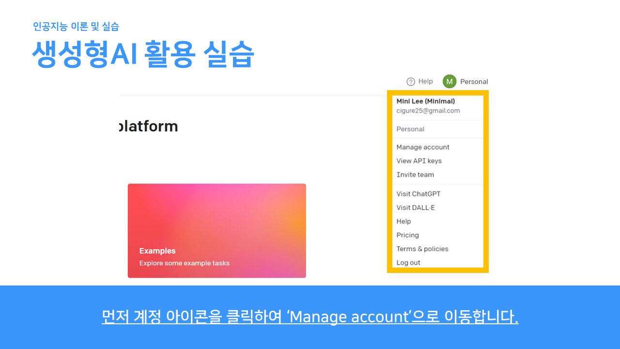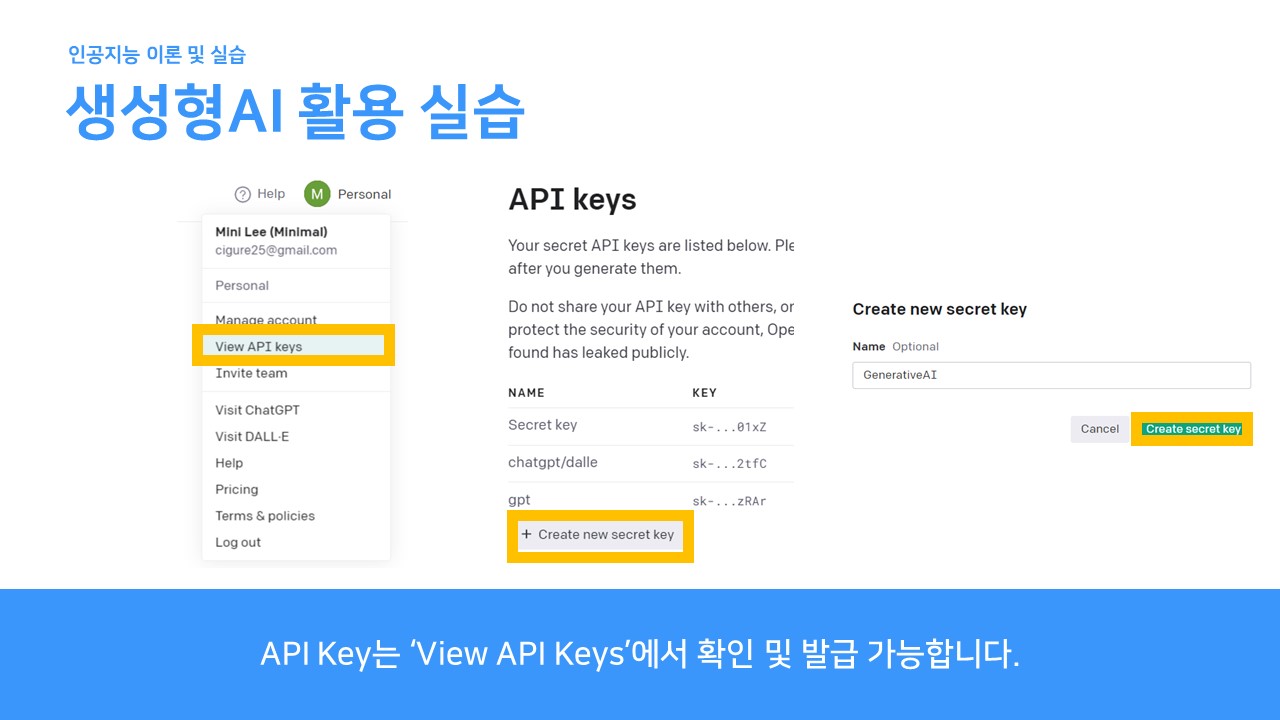 첫 번째로 해야 할 것은 바로챗GPT의 API Key를 연동하는 것입니다. 개별 계정 API Key를 연동해야 입력한 프롬프트으로부터 답변을 받을 수 있기 때문입니다.