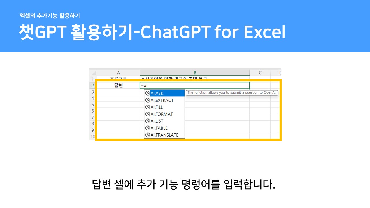 오늘은 챗GPT를 활용한 추가기능의 엑셀에 대해 설명드리고자 합니다. 챗GPT는 이미 많은 API Key 활용을 통해 많은 프로그램에서 활용되고 있습니다. 그 중에서도 마이크로소프트의 엑셀에서 그 능력을 더욱 발휘하고 있습니다. 엑셀에는 VBA라고 하여 비주얼 베이직 애플리케이션을 통해 추가적으로 기능을 커스터마이징할 수 있습니다. 그러나 기본적인 코딩 및 프로그래밍 지식이 필요하기 때문에 엑셀을 활용하는 모든 사람이 활용하기에는 제약이 있었는데요.