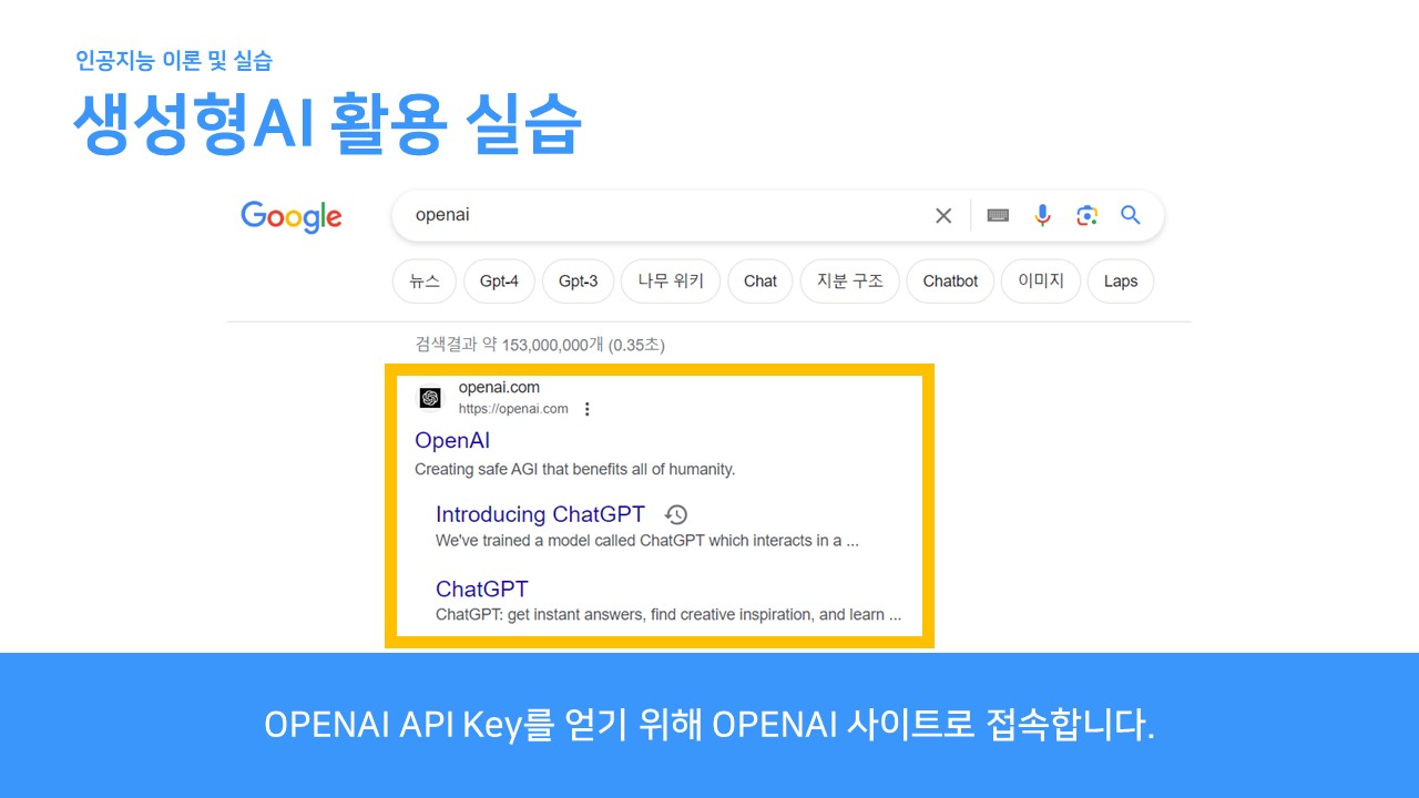 OPENAI의 API Key를 가져오기 위한 방법은 우선 OPENAI를 검색하여 접속합니다.