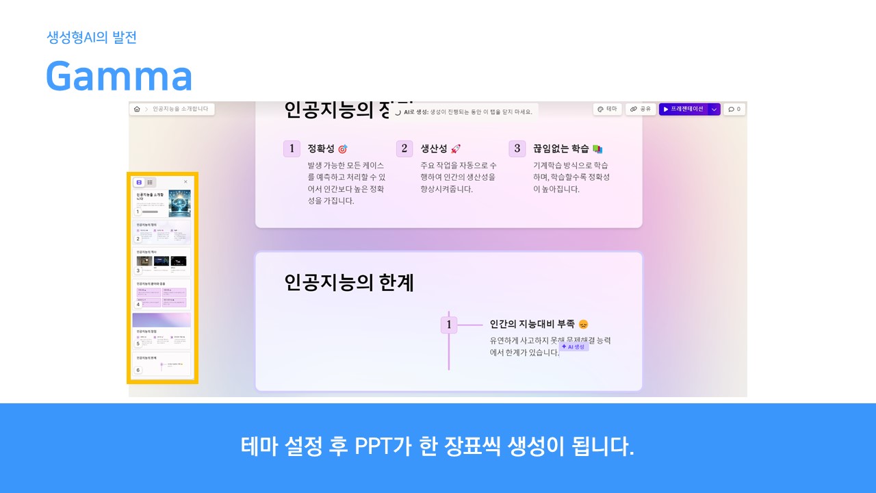 잠시 기다리면, 다음과 같이 PPT 생성이 완료됩니다. 좌측 개요에 따라 각 장표가 생성됩니다. 개요에 따라 각 장표가 생성되는 과정을 확인할 수 있습니다.