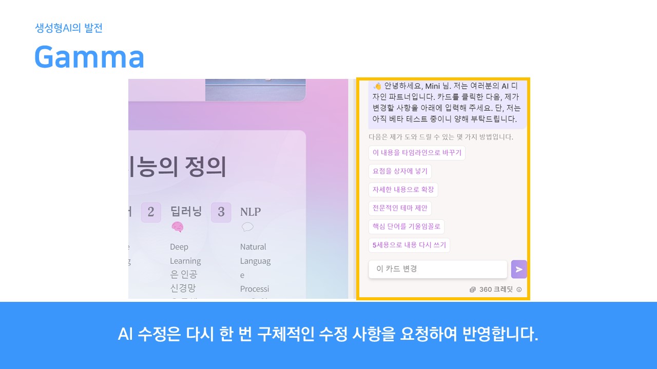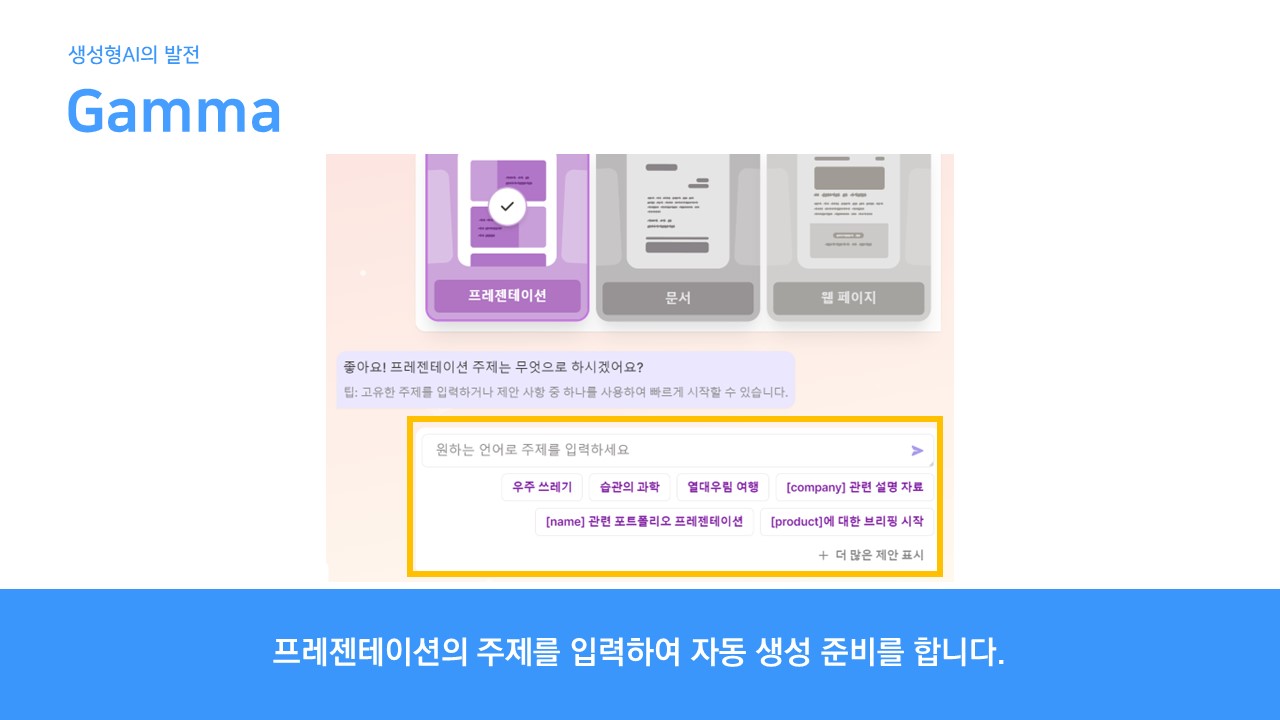 텍스트로 주제를 입력하면 주제와 관련된 내용 및 이미지 등을 가져와 각 장표를 만들어주는 서비스 프로그램입니다. 기본적으로 초안을 생성한 다음 문답 형식으로 추가적으로 인공지능을 통해 수정 보완할 수 있습니다.