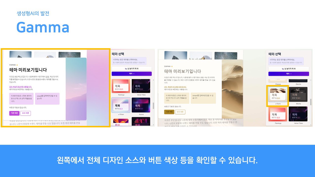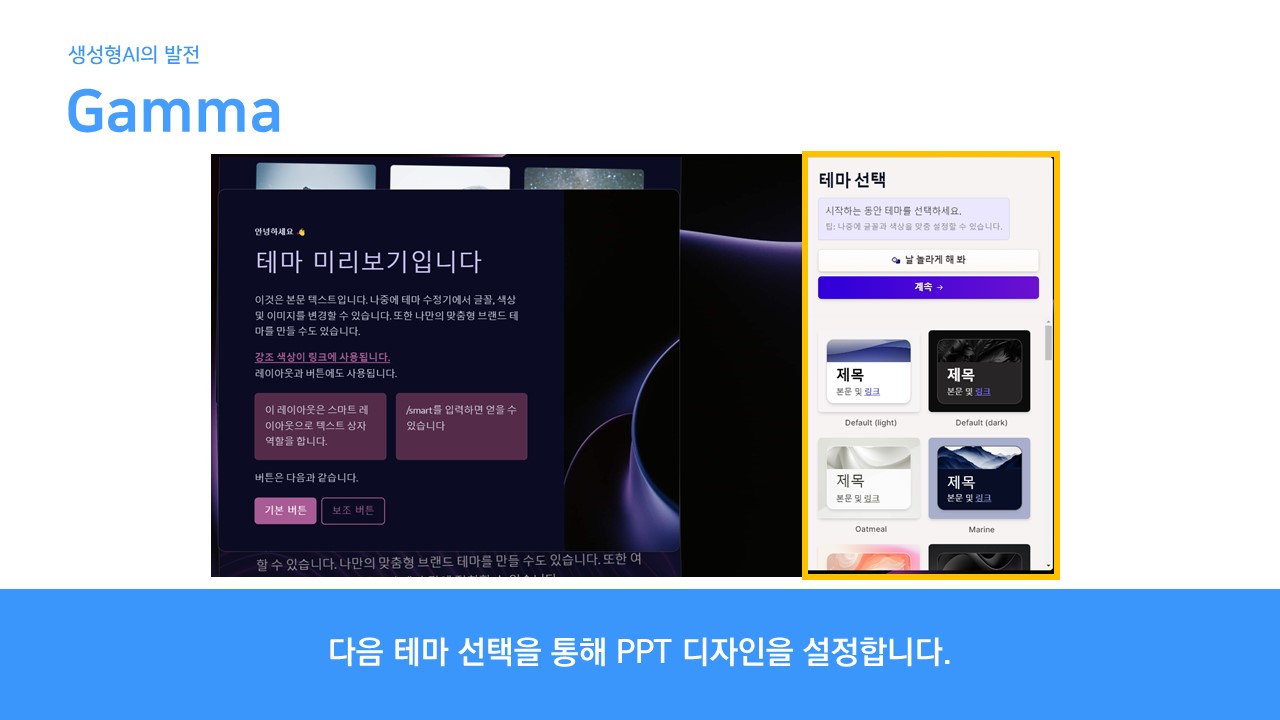 MS의 PPT에서도 디자인을 선택할 수 있지만(잘 사용은 안하지만.) 인공지능을 활용하여 PPT를 만들 때에는 선택해야 합니다.