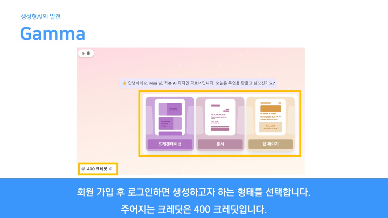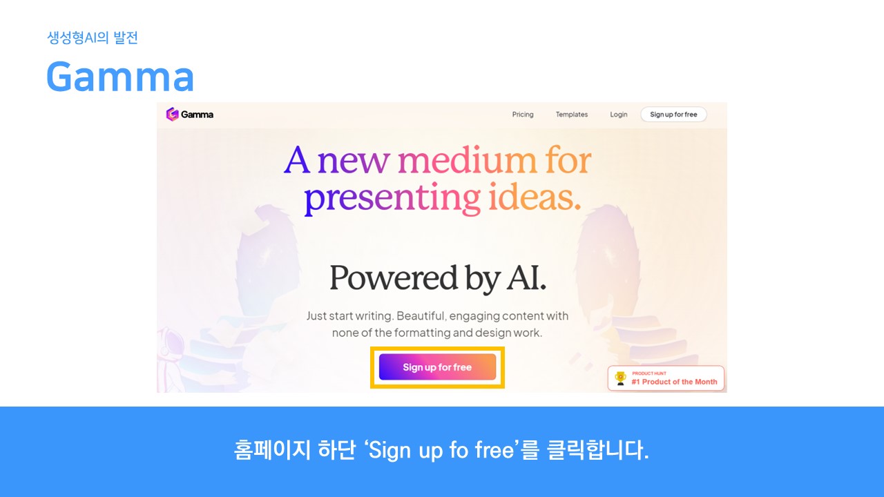 오늘은 'Gamma'라는 PPT 자동 생성 AI 프로그램을 사용해보겠습니다.