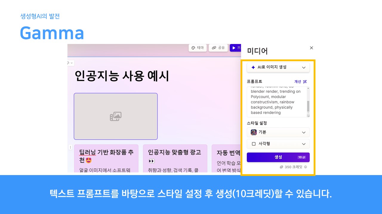 이미지를 넣고 싶은 부분에 기능을 활성화시키고, 프롬프트와 스타일을 지정하여 이미지를 생성합니다. 역시 이미지 생성에 10 크레딧이 소모됩니다.
