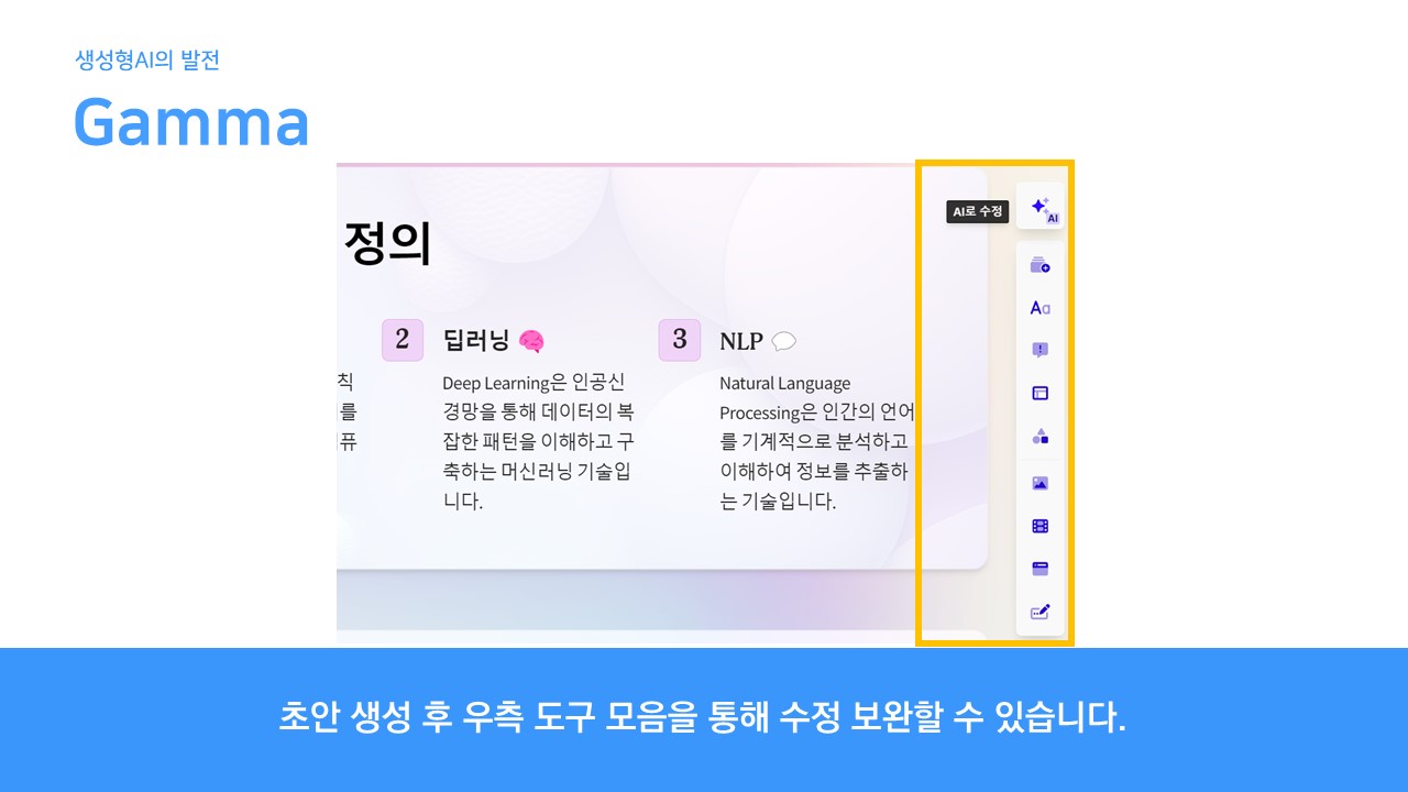 초안 생성 후에는 우측 도구 모음을 활용하여 수정이 가능합니다.