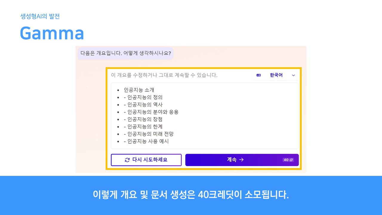 주제를 입력하면 주제에 따른 개요를 먼저 작성하여 검토받습니다. 주제에 따른 개요 작성 예시만 확인하는 것만으로도 충분히 도움이 될 수 있습니다. 개요 확인 후 PPT 장표를 생성하는 데에는 40크레딧이 소모됩니다.