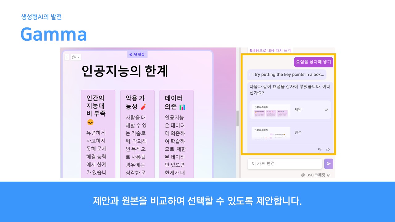 내가 만들 수 없다고, 기억할 수 없다고, 생각할 수 없다고 인공지능과 자신을 비교하기보다는 결과물에 대해 내가 어떻게 활용할 것인지, 부족한 부분은 없는 지 판단할 수 있는 역량을 키우는 것이 더욱 중요하겠습니다.