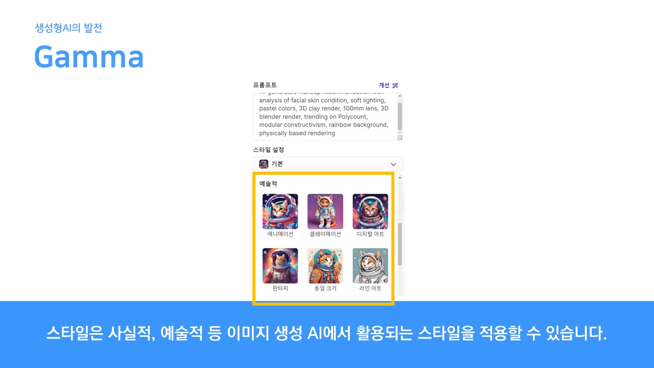 스타일에는 애니메이션 부터 라인 아트 등 같은 프롬프트라고 하더라도 원하는 디자인 형태로 생성할 수 있습니다.