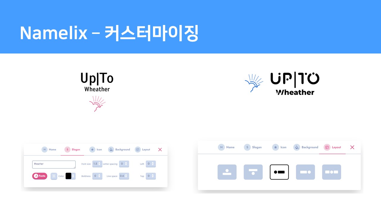 색상, 폰트, 아이콘 이미지와 레이아웃을 고려한 최종 브랜드 네이밍 후보를 선택합니다.